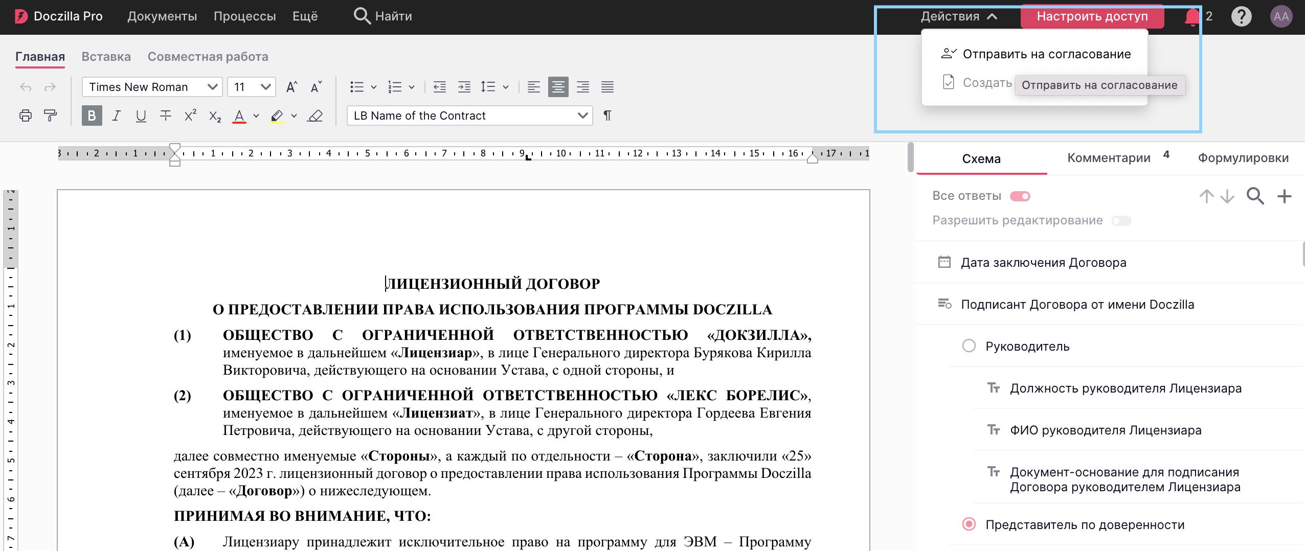 Запустить на согласование документ можно непосредственно из документа, нажав на кнопку Действия