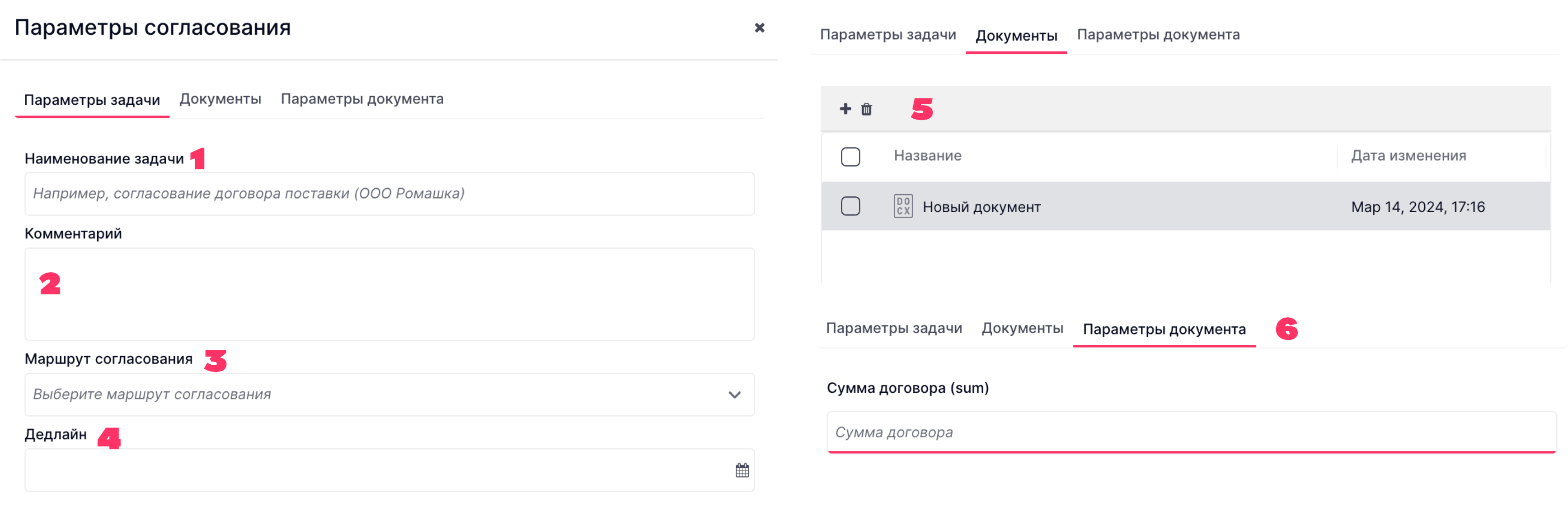 Отправить на согласование — это возможность создания задачи с привязкой к шаблону рабочего процесса. После выбора маршрута согласования появится настройка выбора согласующих и параметров (условий) документа.