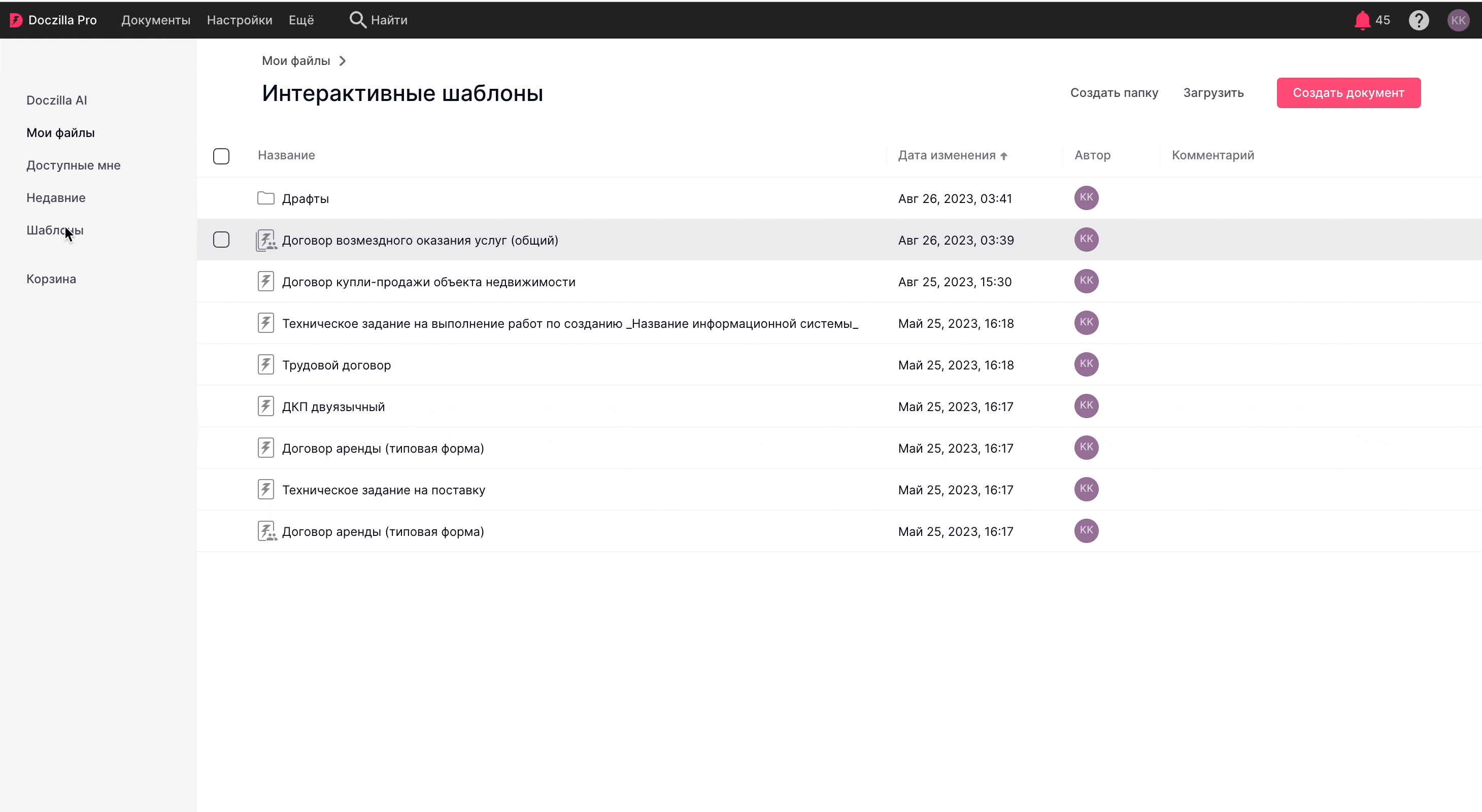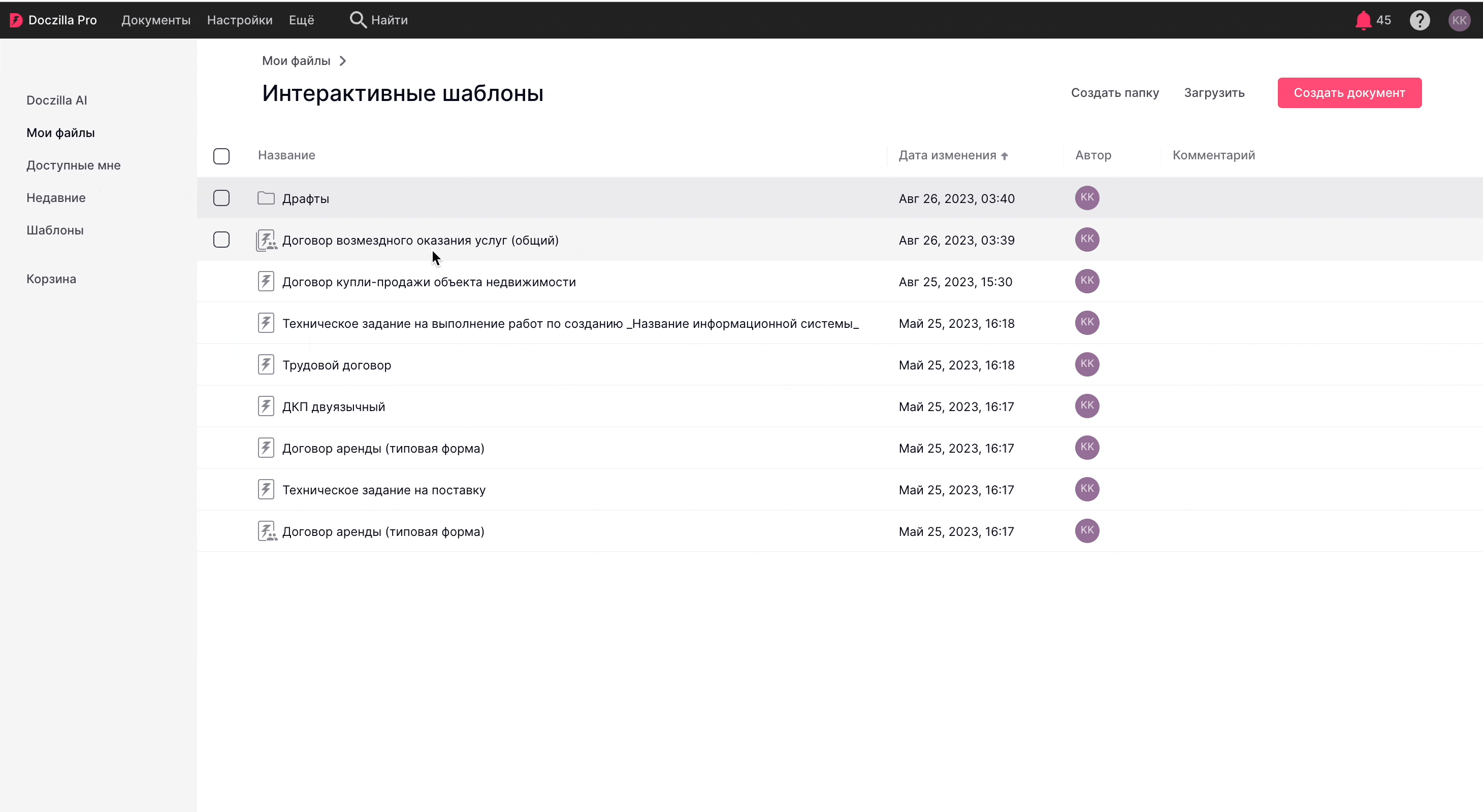 Также через кнопку "Создать" доступно создание других форматов документов (docx, dotx), создание папки и загрузка документов с диска компьютера.