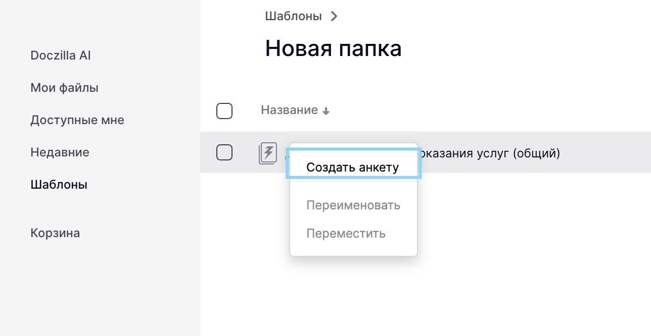Если шаблон был опубликован, то есть возможность создать анкету из соответствующего раздела. Для этого необходимо перейти в раздел Шаблоны, выбрать необходимый документ, нажать правой кнопкой мыши и нажать на кнопку Создать анкету