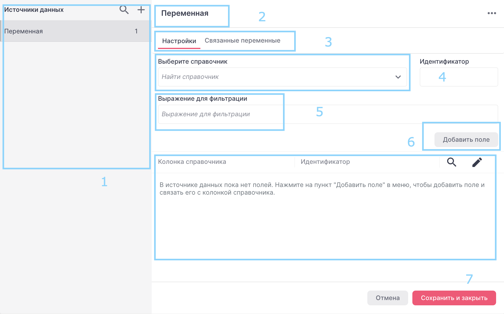 Если это ваша первая связка в документе, то нужно перейти к созданию источника данных, кликнув на кнопку "Добавить".