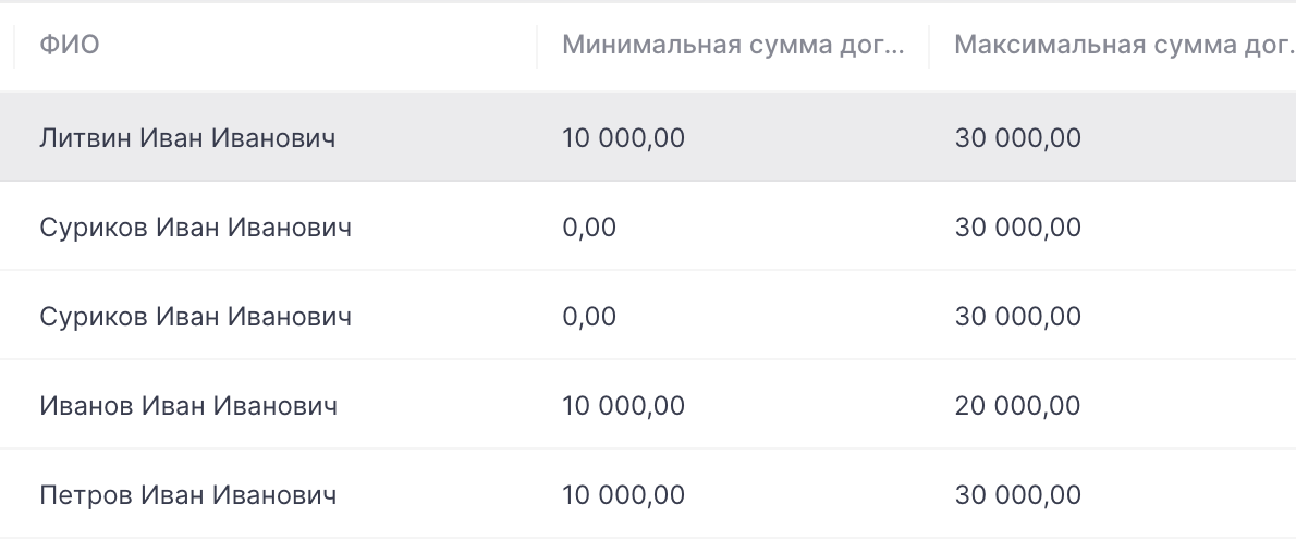 1) У нас есть справочник подписантов, включающий минимальную и максимальную сумму договора: