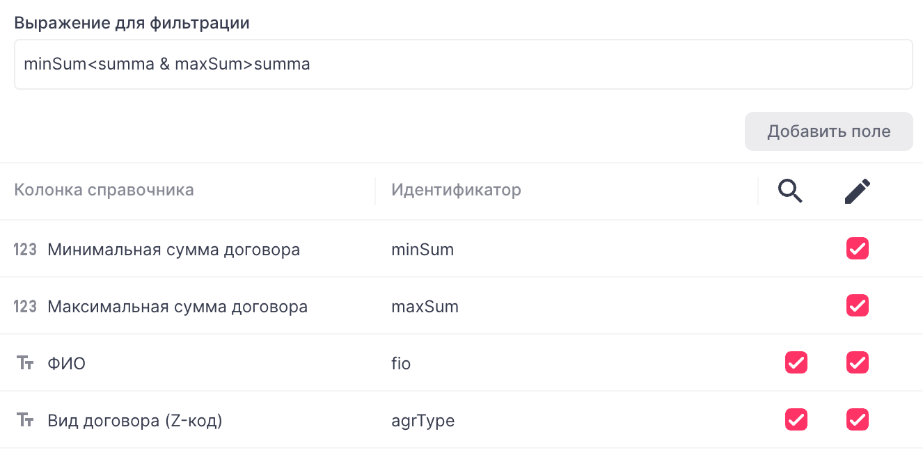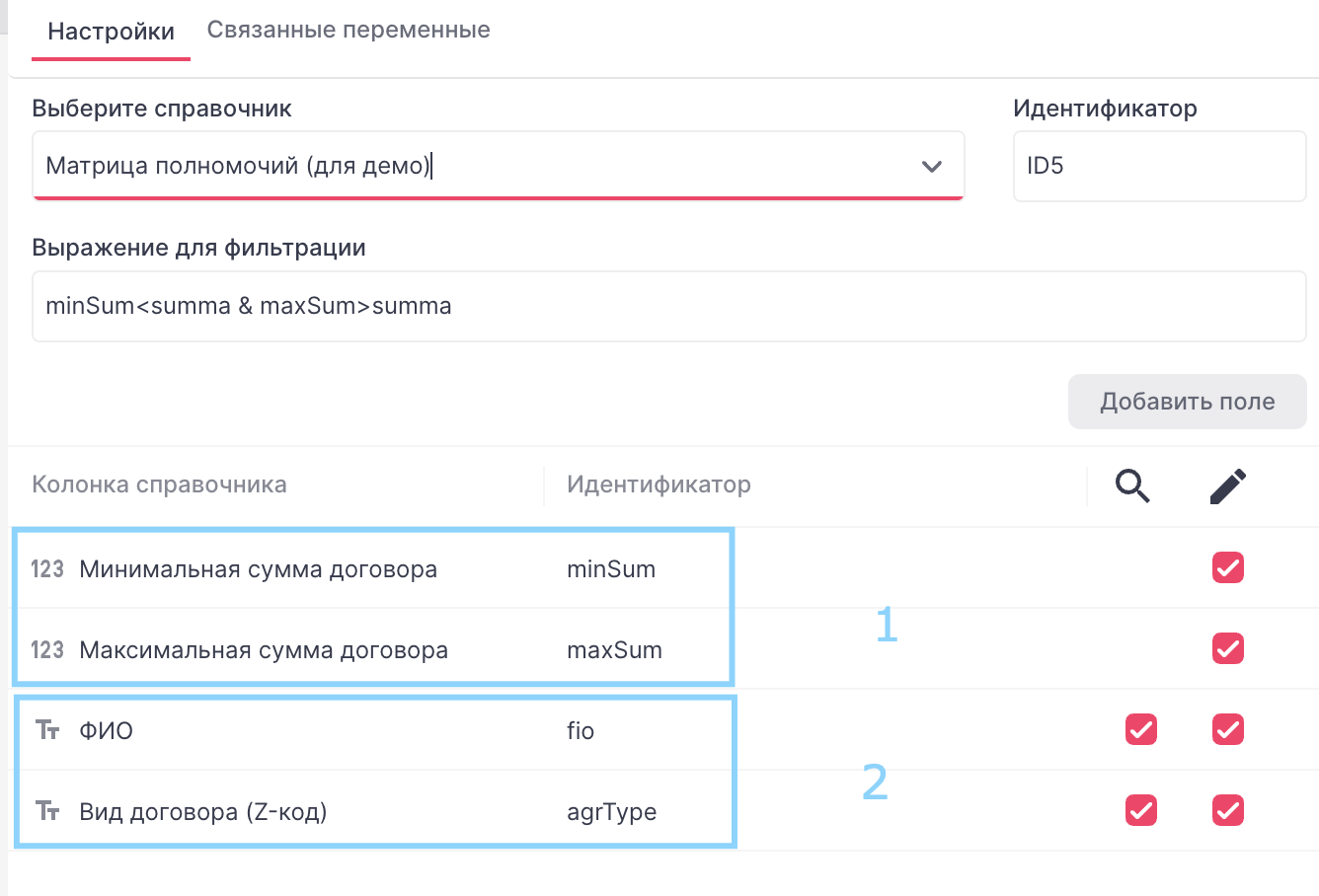 💡 Например, у вас есть справочник подписантов, разные подписанты могут подписывать контракты на разные суммы. И вы можете настроить фильтрацию, в зависимости от суммы указанной в договоре, фильтровать подписантов. Таким образом, при заполнении анкеты пользователь не ошибется при выборе подписанта.