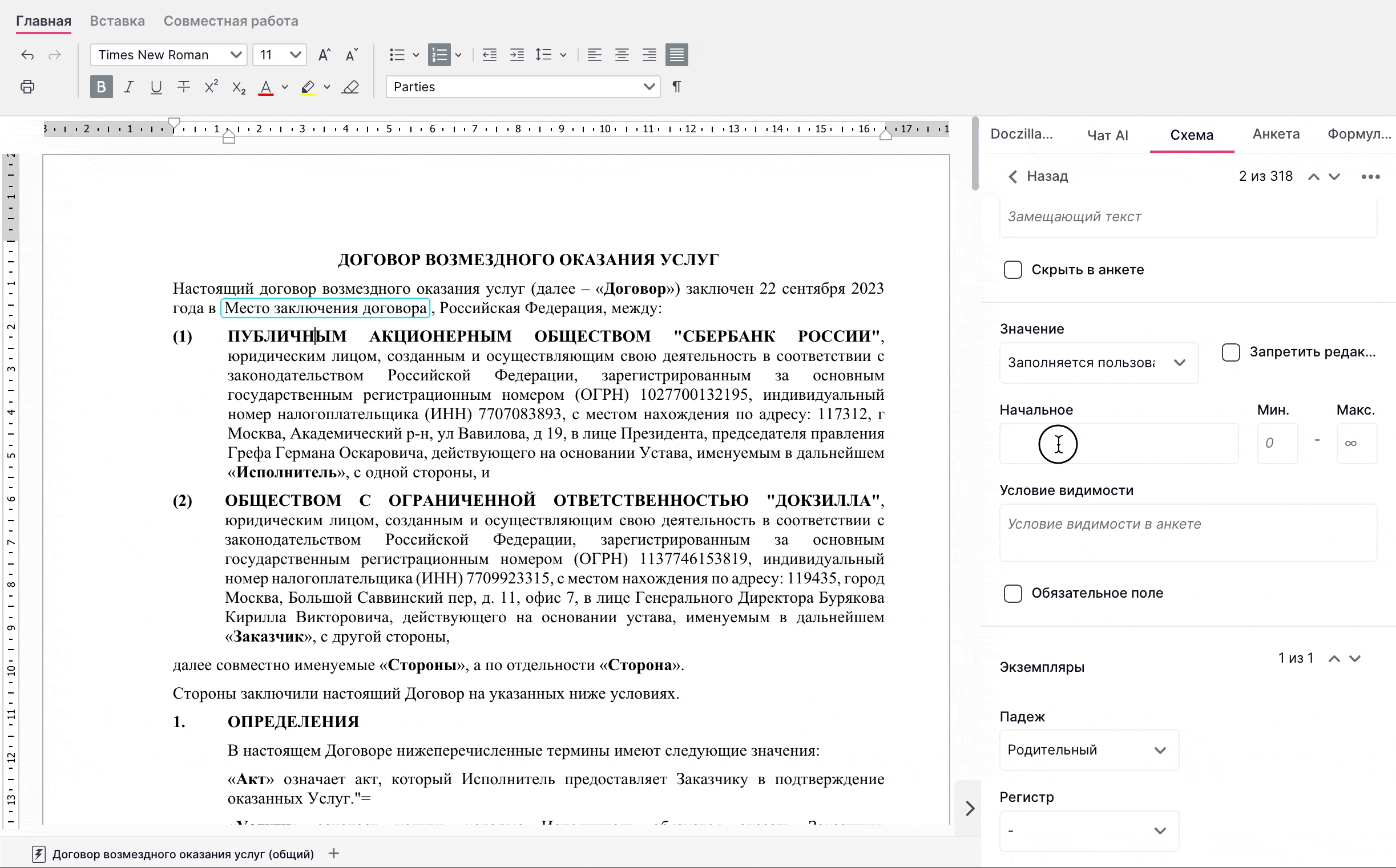 (2) Падеж - склонение слова или нескольких слов. Доступны все 6 падежей русского языка. Каждое введенное в поле анкеты слово будет автоматически конвертировано в заданный падеж на рабочей странице документа. Необходимо иметь в виду, что в поле анкеты склонение слов не будет отображаться. Падеж может быть настроен индивидуально для каждого экземпляра одной переменной.