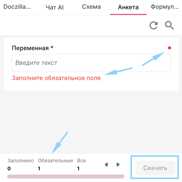 (12) Обязательное поле - если параметр включен, то поле в анкете обязательно для заполнения, в противном случае документ скачать не получится. На обязательность поля указывает красная точка около переменной, а при клике на поле переменной появляется дополнительная надпись.