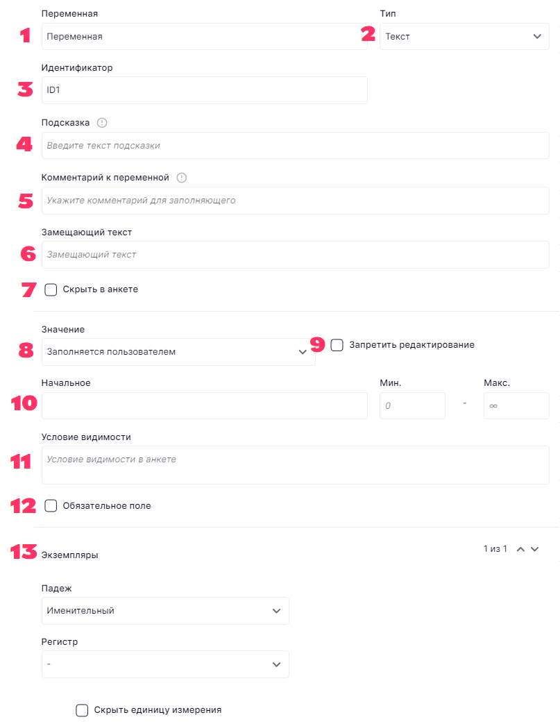 (7) Скрыть в анкете - функция позволяет скрыть переменную из анкеты и она не будет доступна пользователям для заполнения. Например, это акутально, когда переменная автоматически заполняется за счет формул, из справочника или через интеграцию с внешними ресурсами.