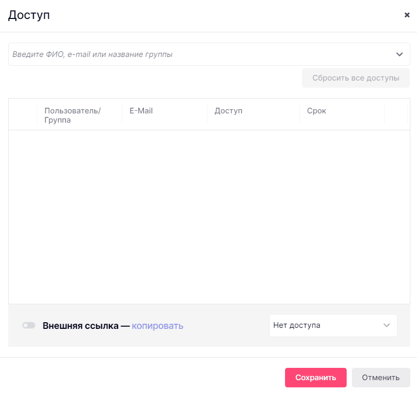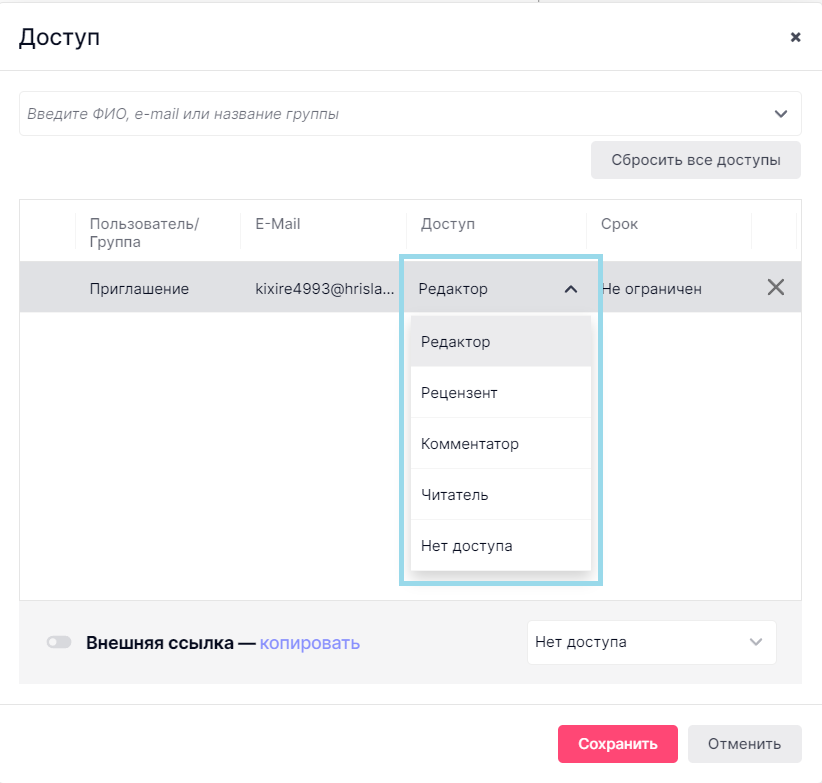 В диалоговом окне Доступ в поле для ввода ввести email-адрес пользователя. Адрес валидируется и появляется в списке для выбора.