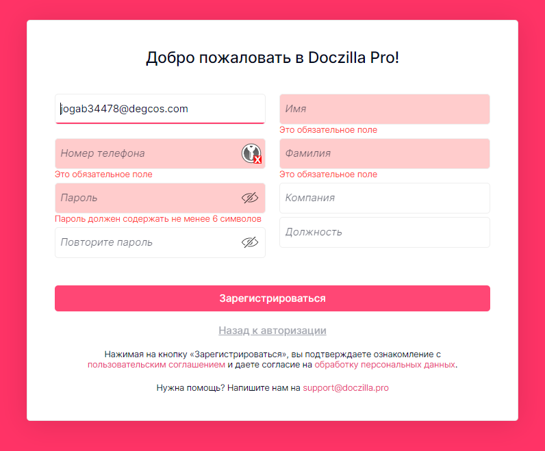 После нажатия на кнопку открыть, пользователь попадет на страницу регистрации в Doczilla