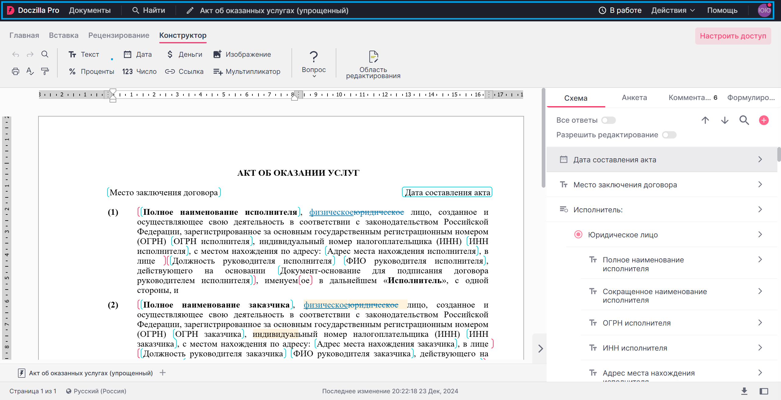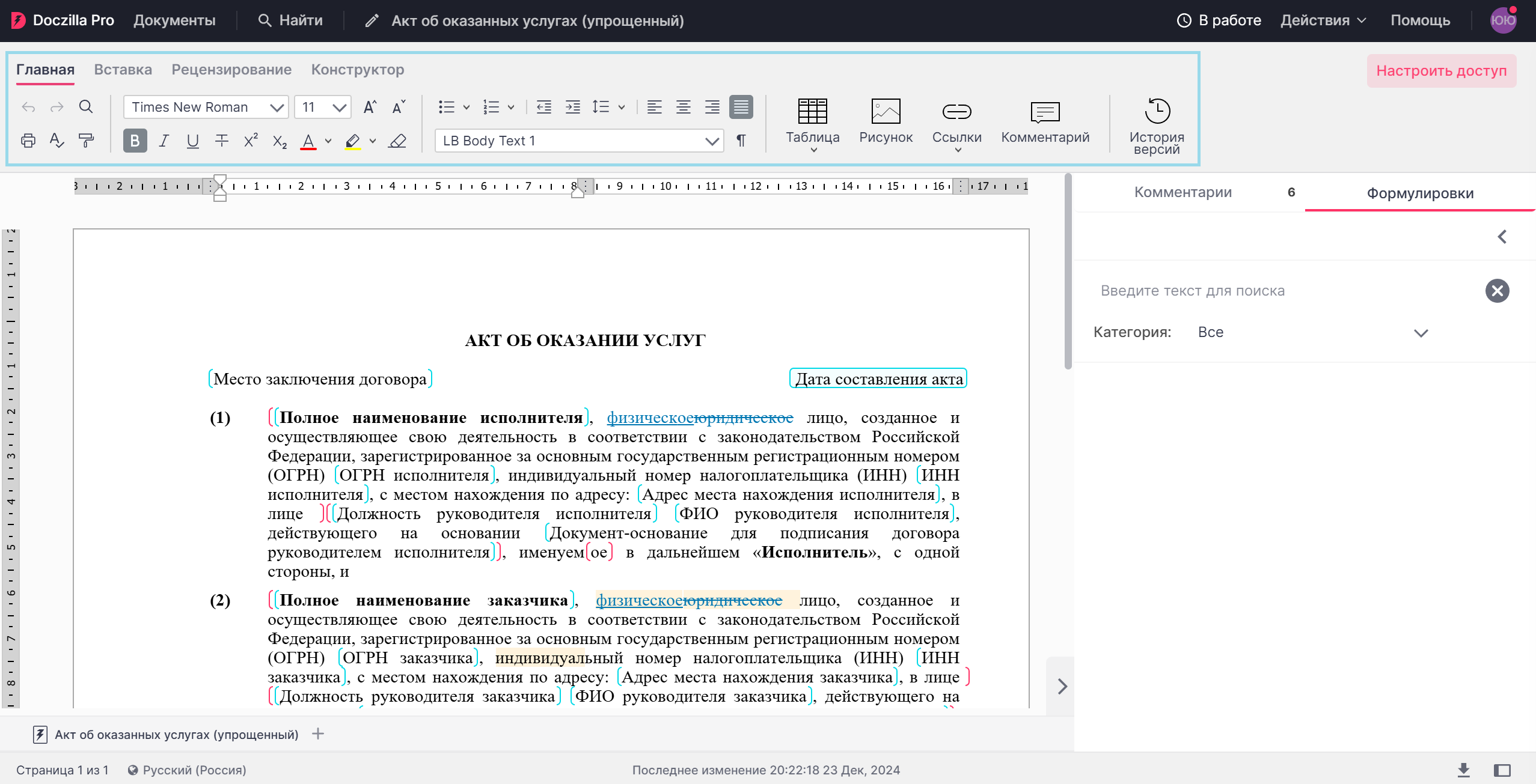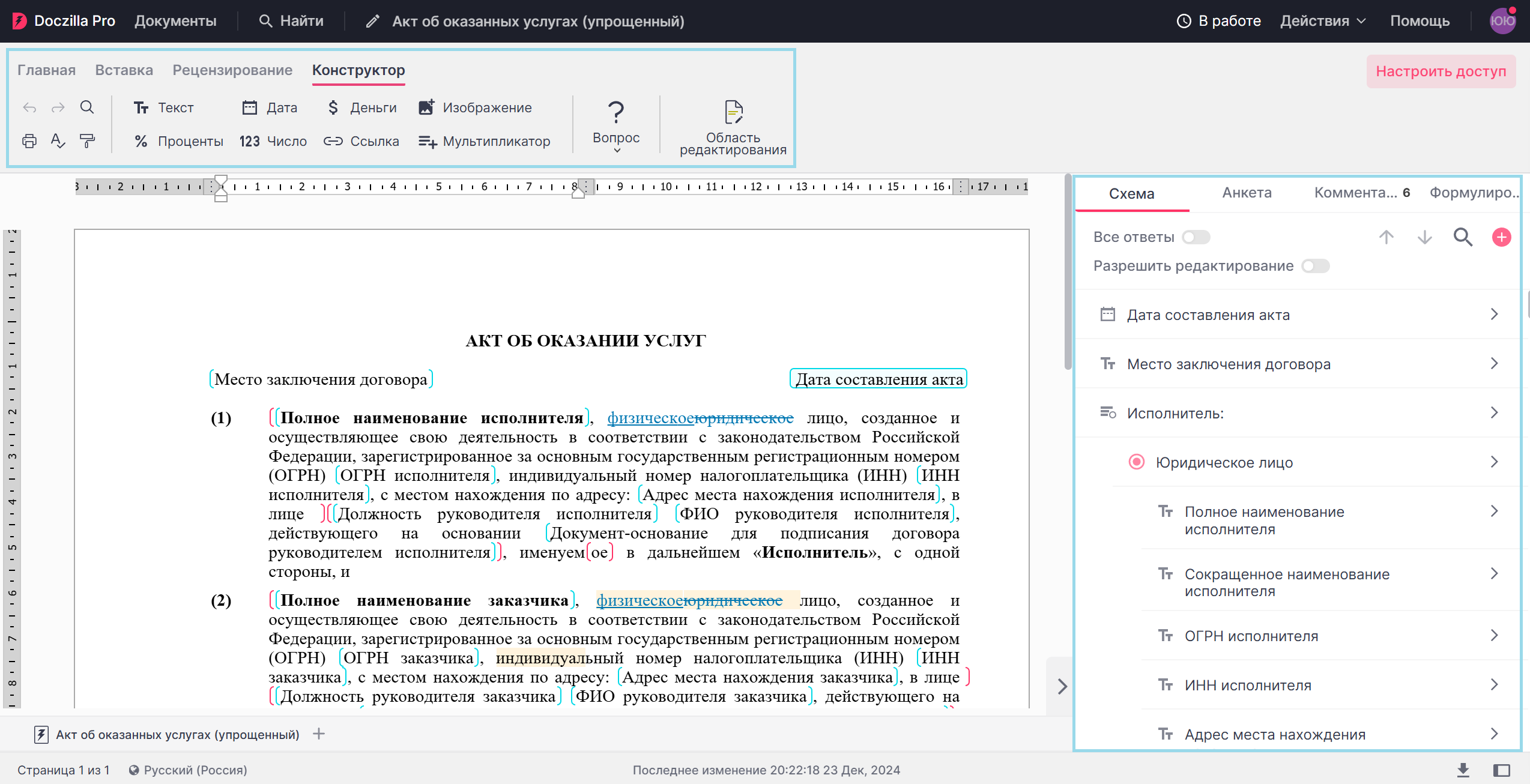 После открытия документа, пользователям Doczilla, в зависимости от уровня доступа, доступны разные элементы взаимодействия и работы с текстом, шаблоном или анкетой.
