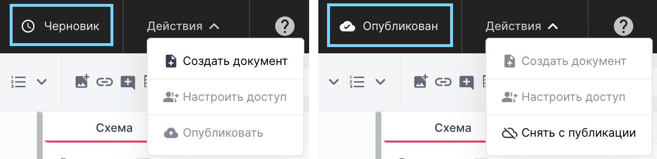 - Черновик - шаблон в работе, доступна функция Опубликовать