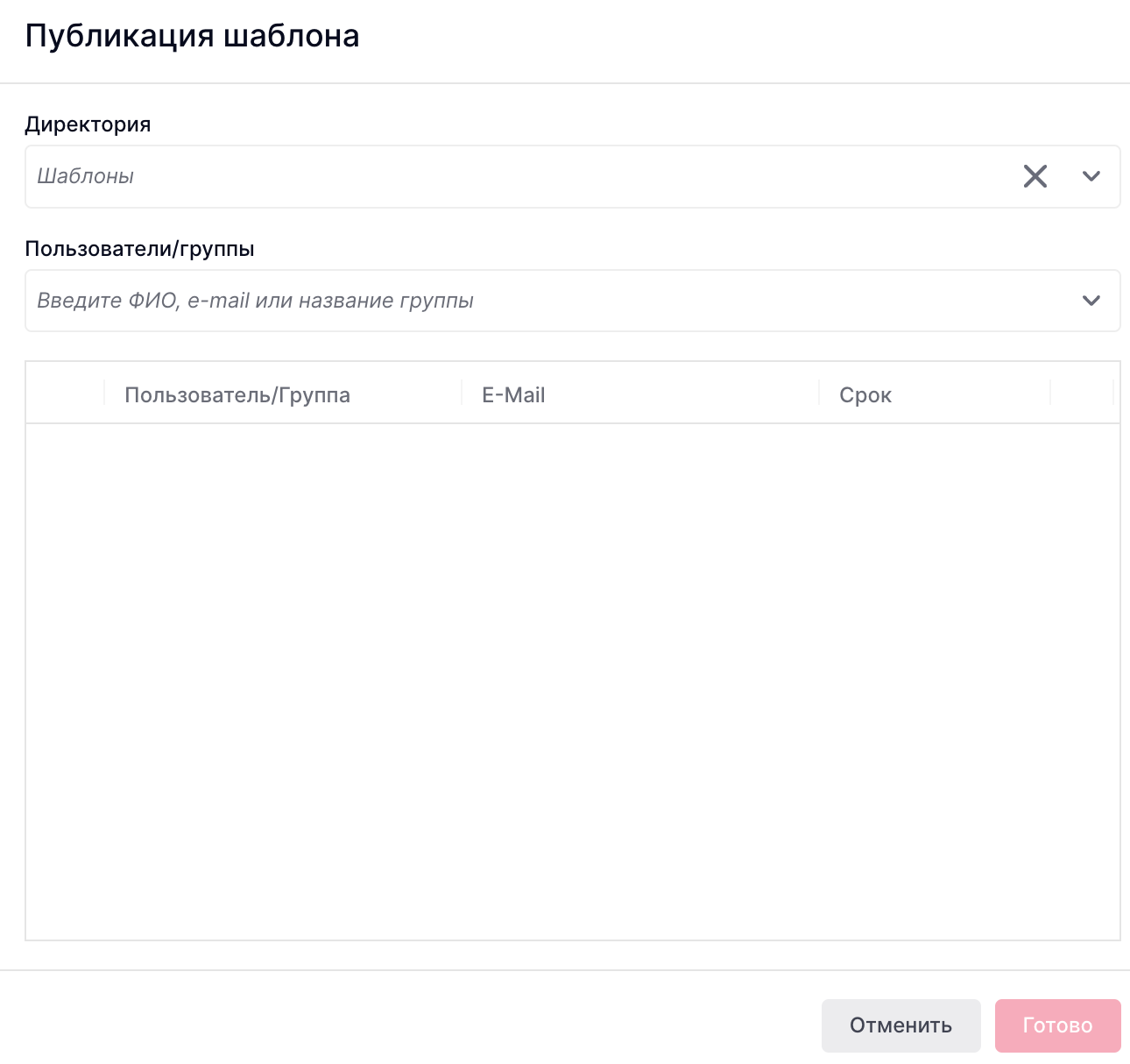 - Пользователя/группу - пользователей или группу пользователей, которые увидят этот шаблон.