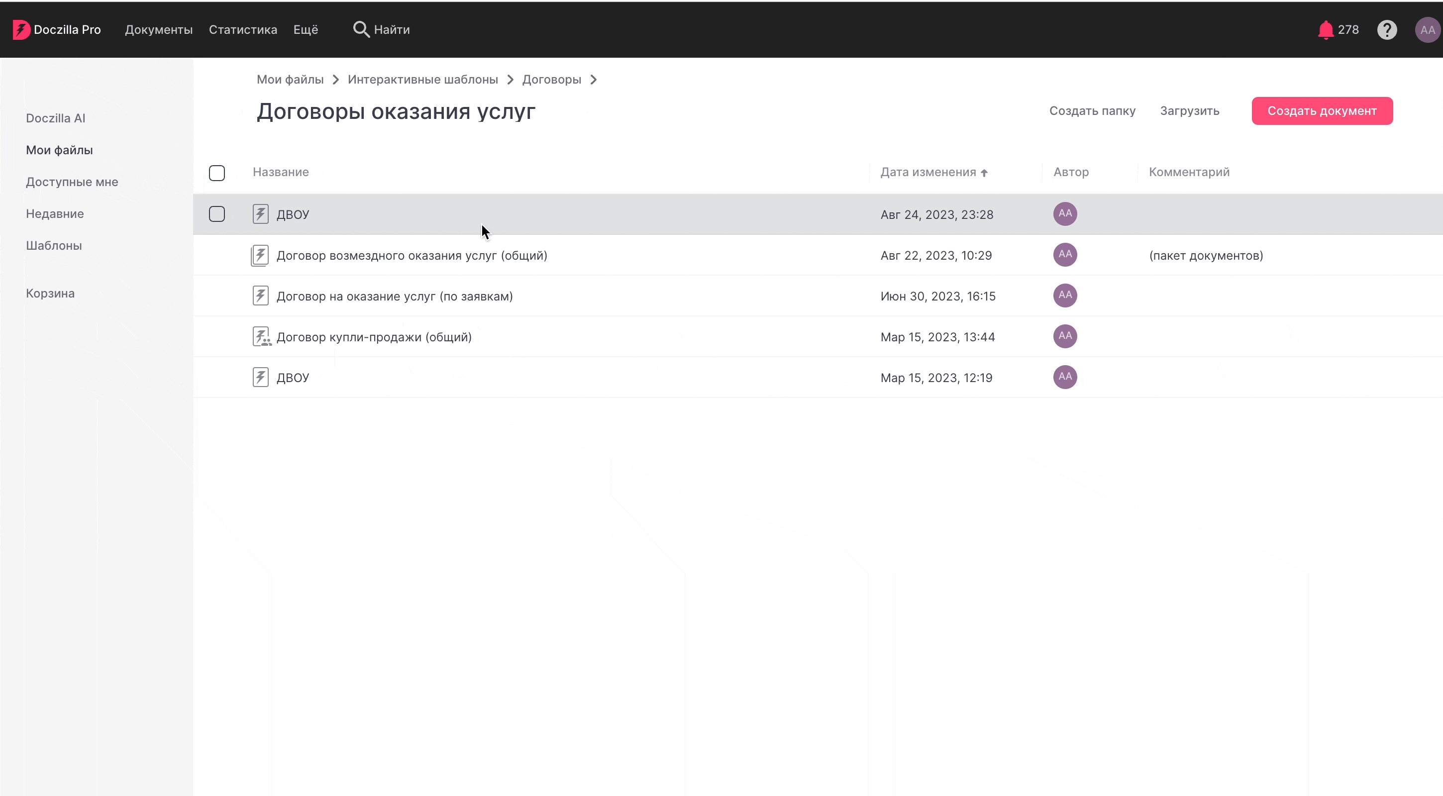 - Опубликован - шаблон готов, его можно передавать в виде анкеты для составления документов, доступна функция Снять с публикации