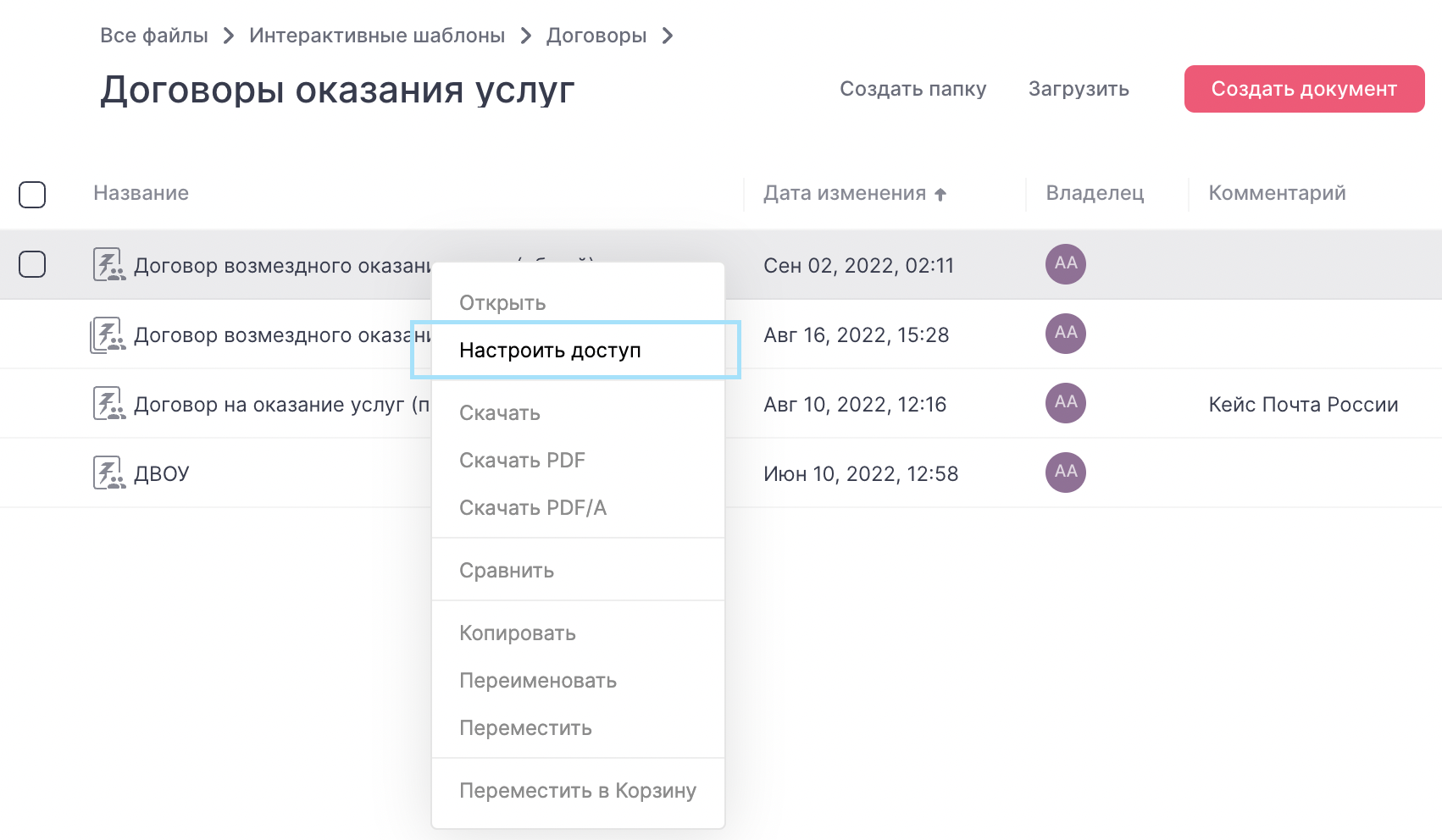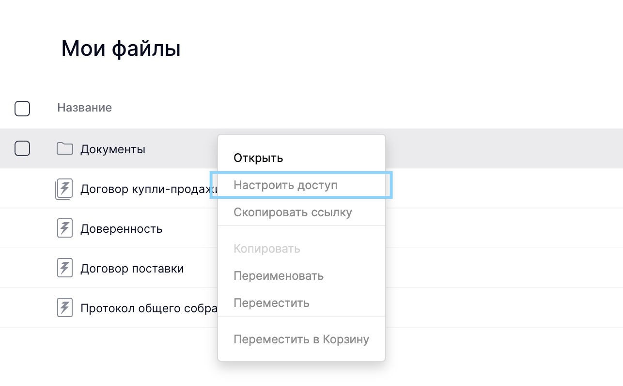 Доступ к документу можно дать из файлового хранилища. Для этого необходимо нажать правой кнопкой мыши по документу и выбрать опцию "Настроить доступ". Процесс настройки не отличается от действий в прошлом пункте.