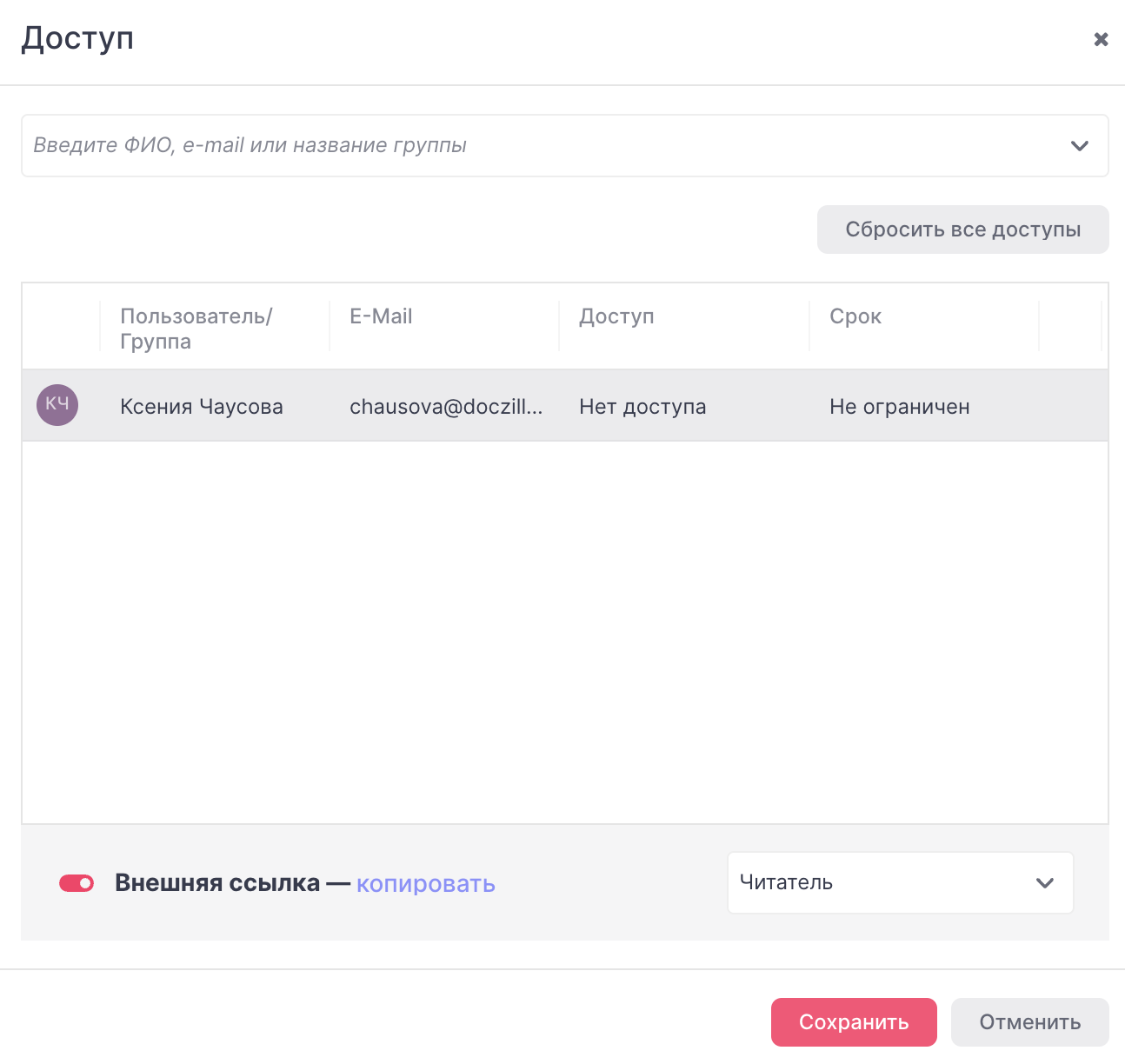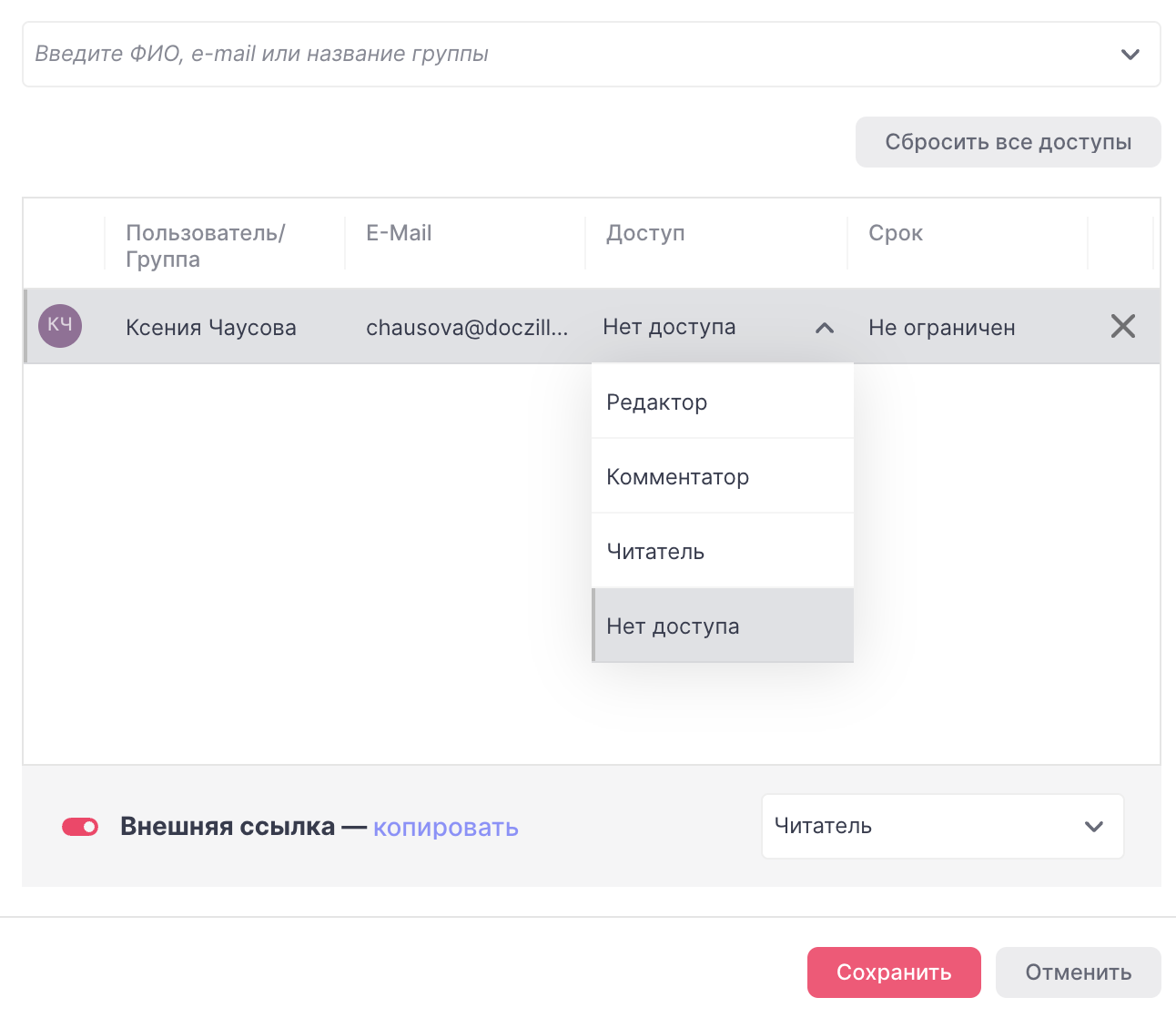Для того, чтобы удалить доступ к документу или папке, в окне настроек доступов необходимо поставить техническую "роль" - "Нет доступа" и нажать на кнопку "Сохранить".