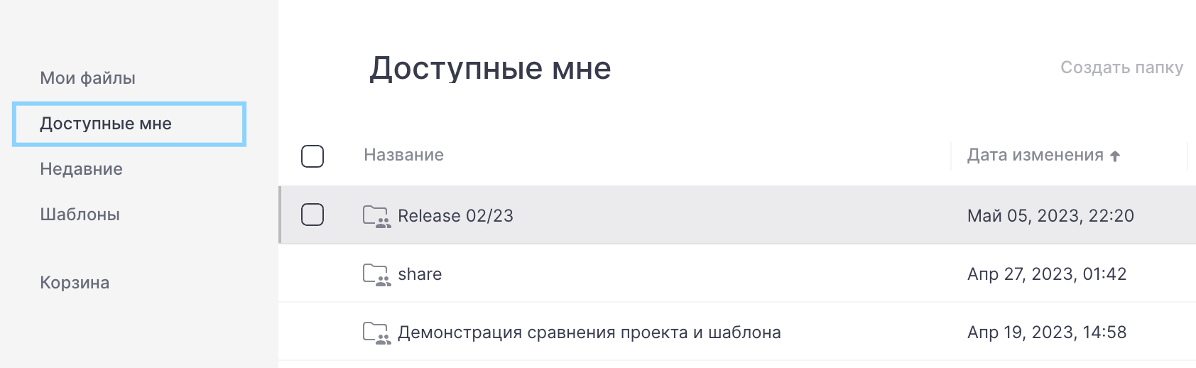 В разделе отображены все документы и папки, к которым пользователю были предоставлены доступы. При этом, создать новый документ или папку в это разделе нельзя.