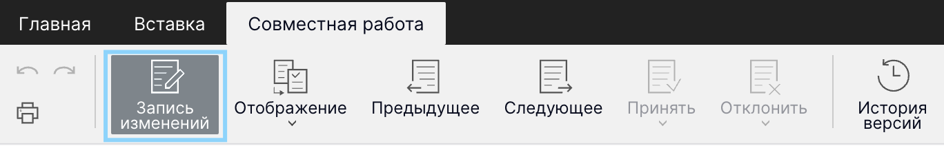 Режим рецензирования включается командой Запись изменений в меню Совместная работа.