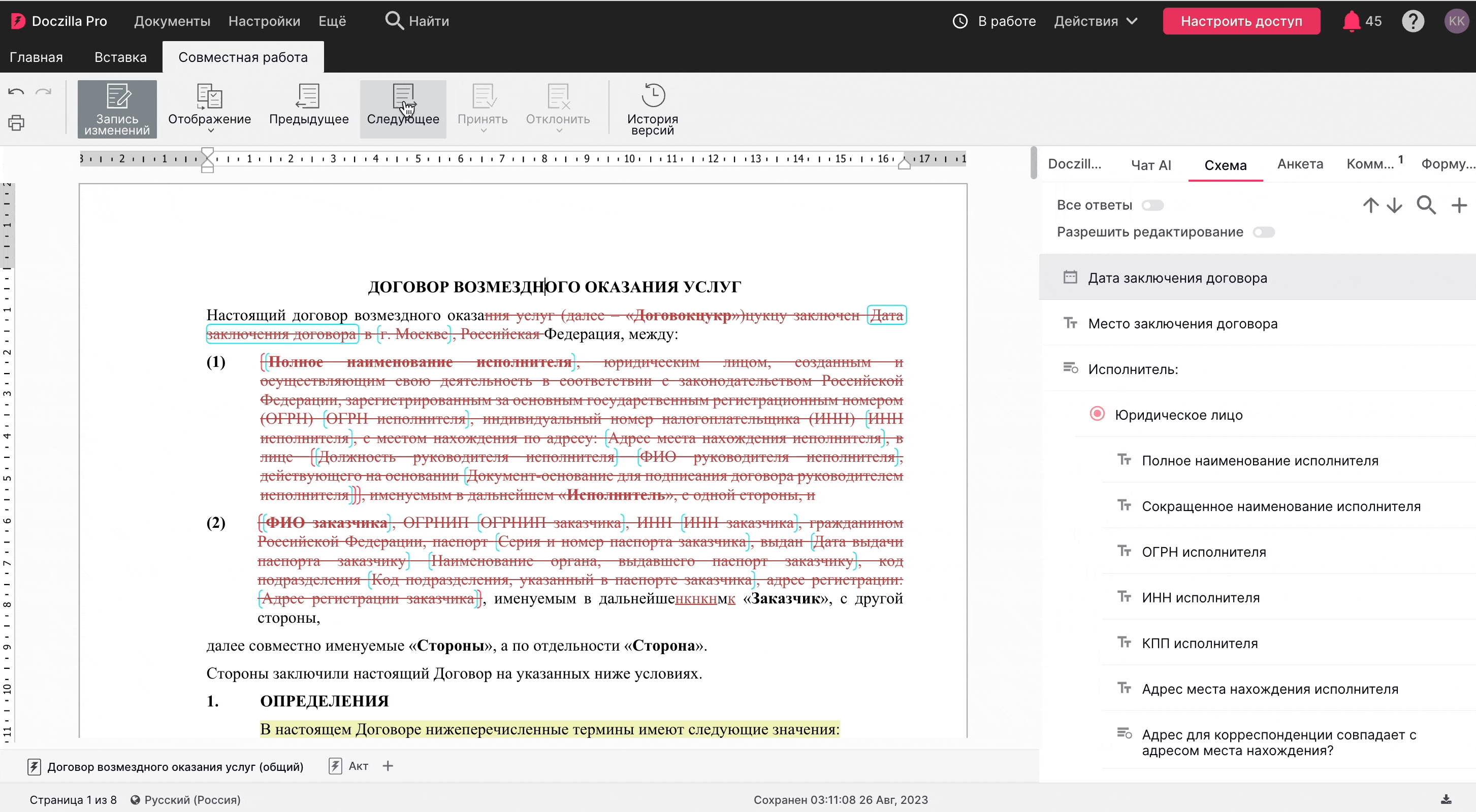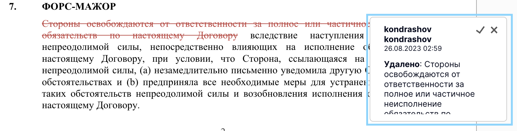 Если над документом работают несколько пользователей, то изменения будут подсвечиваться в системе разными цветами.