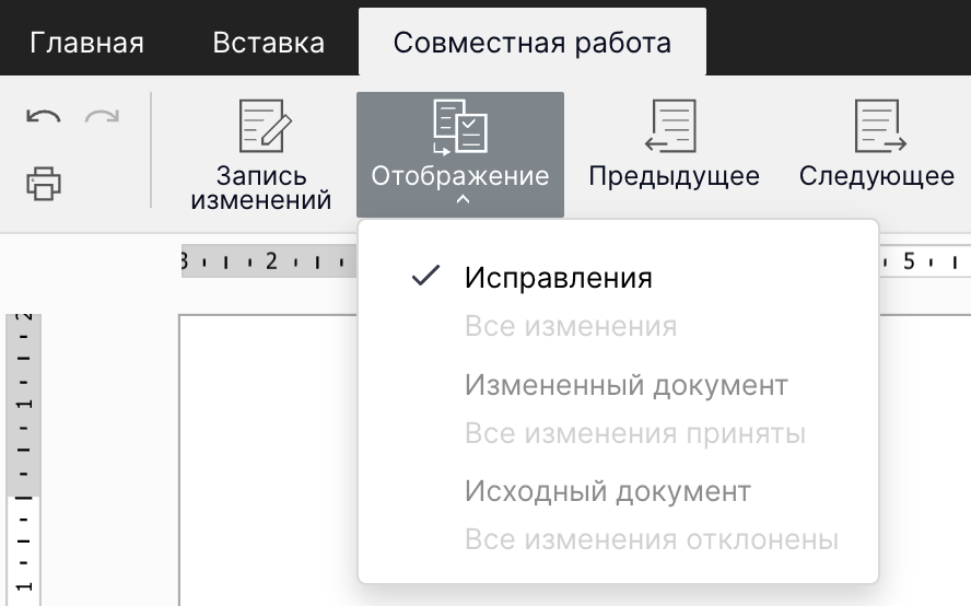 Нажмите на кнопку Отображение на вкладке Совместная работа и выберите один из доступных режимов.
