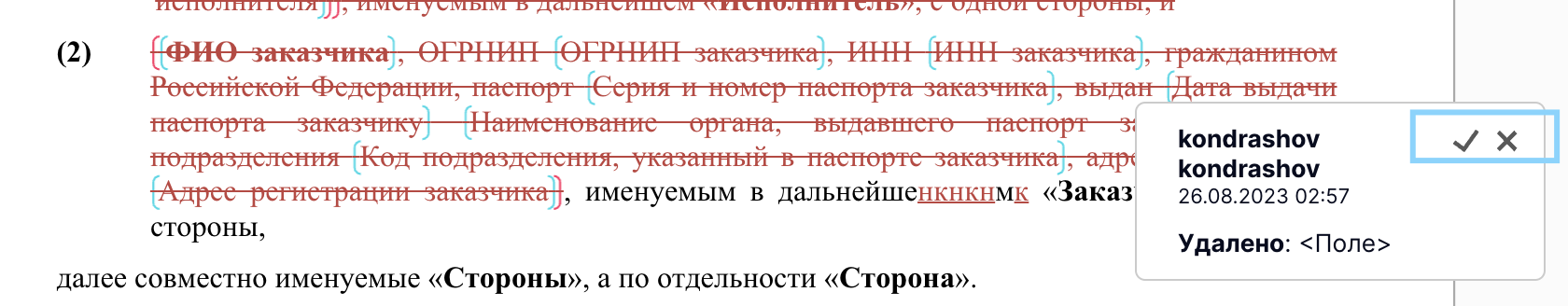 Принять или отклонить изменение можно нажав на галочку или крестик около окошка с информацией об изменении