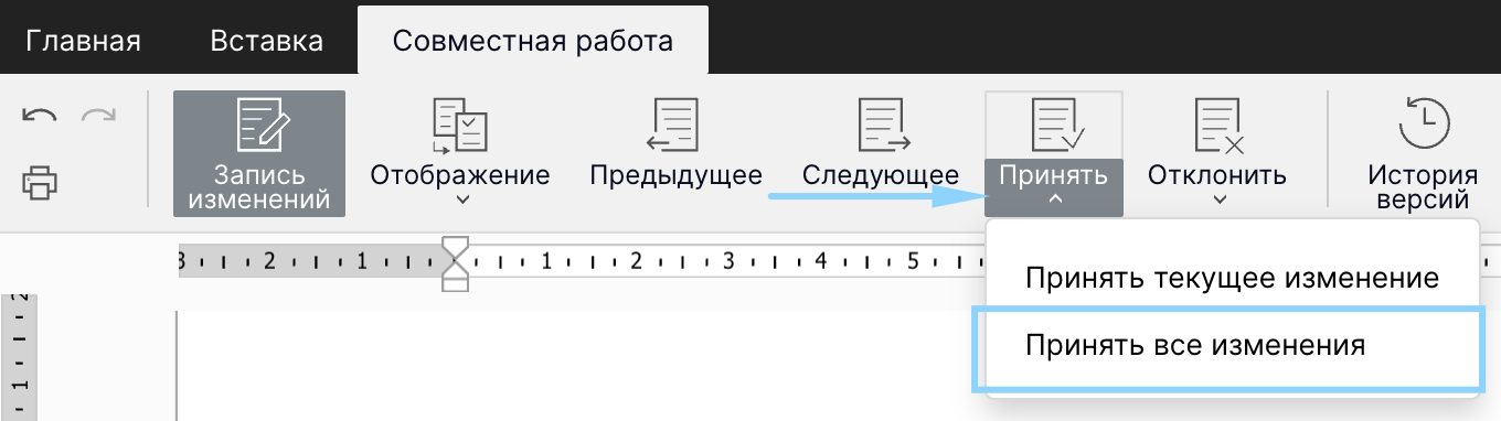 Чтобы быстро принять все изменения, нажмите направленную вниз стрелку под кнопкой Принять и выберите опцию Принять все изменения