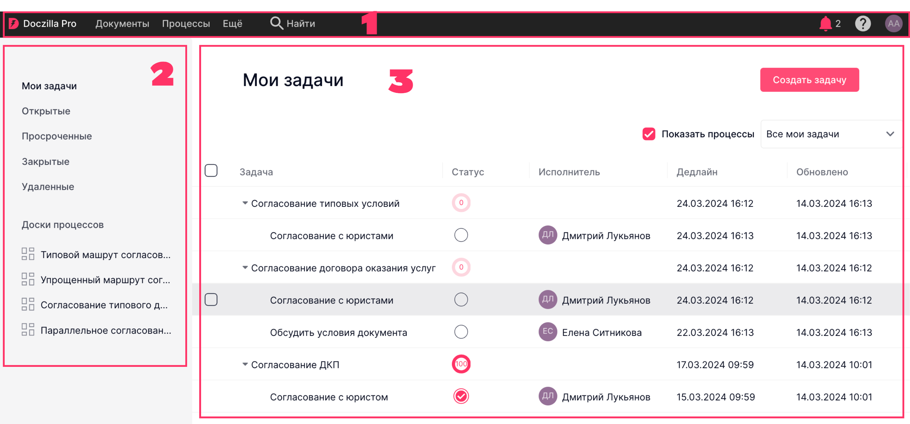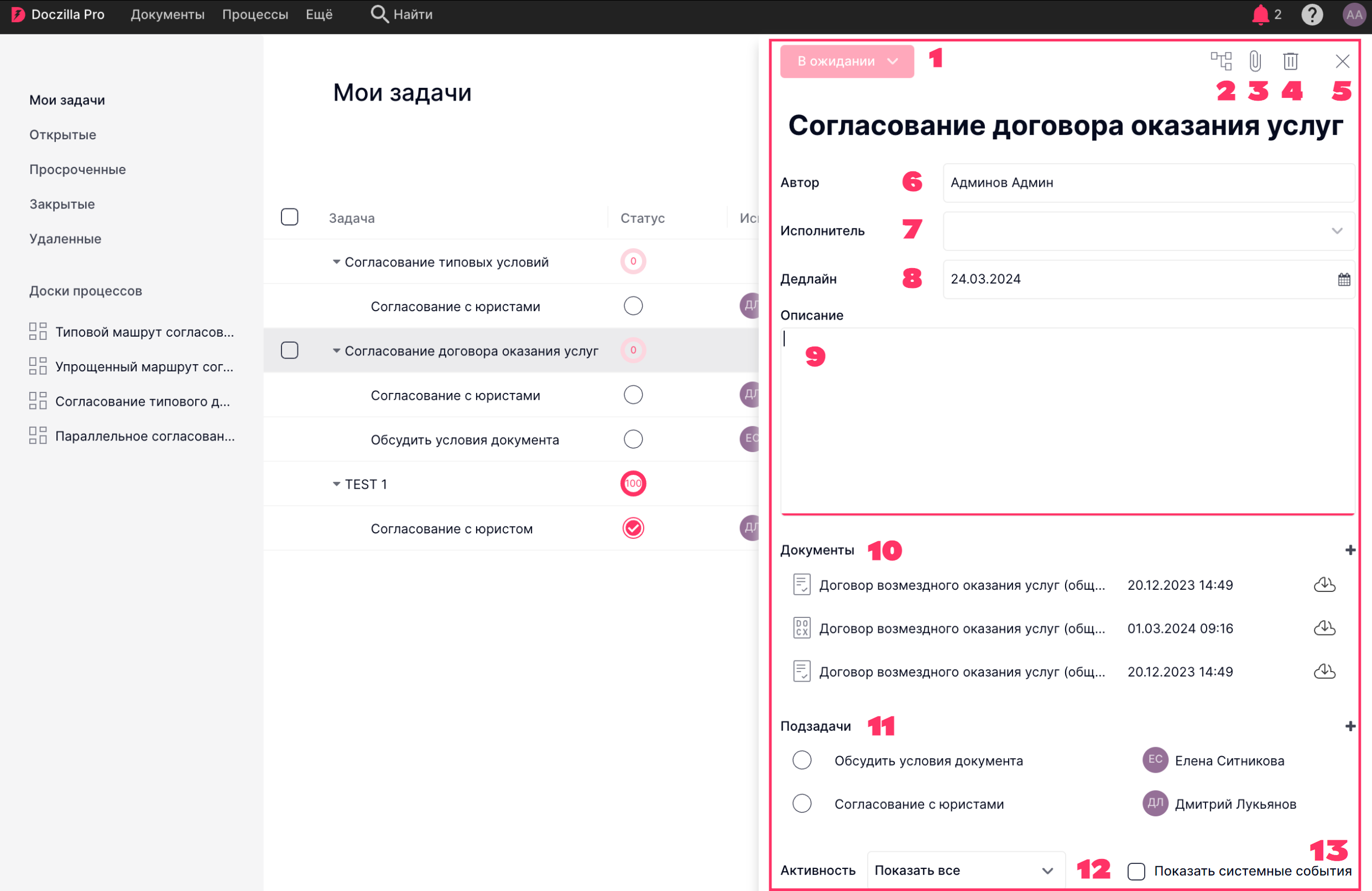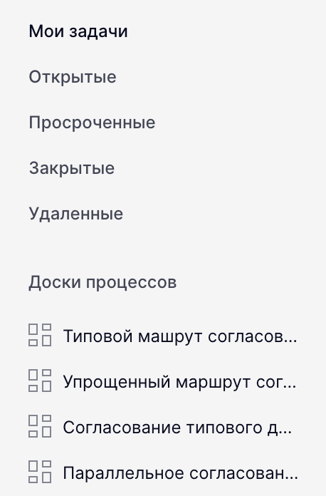 - Боковая панель обеспечивает доступ к главной странице, разделам «Мои задачи», «Открытые», «Просроченные», «Закрытые», а также к доскам маршрутов согласования.