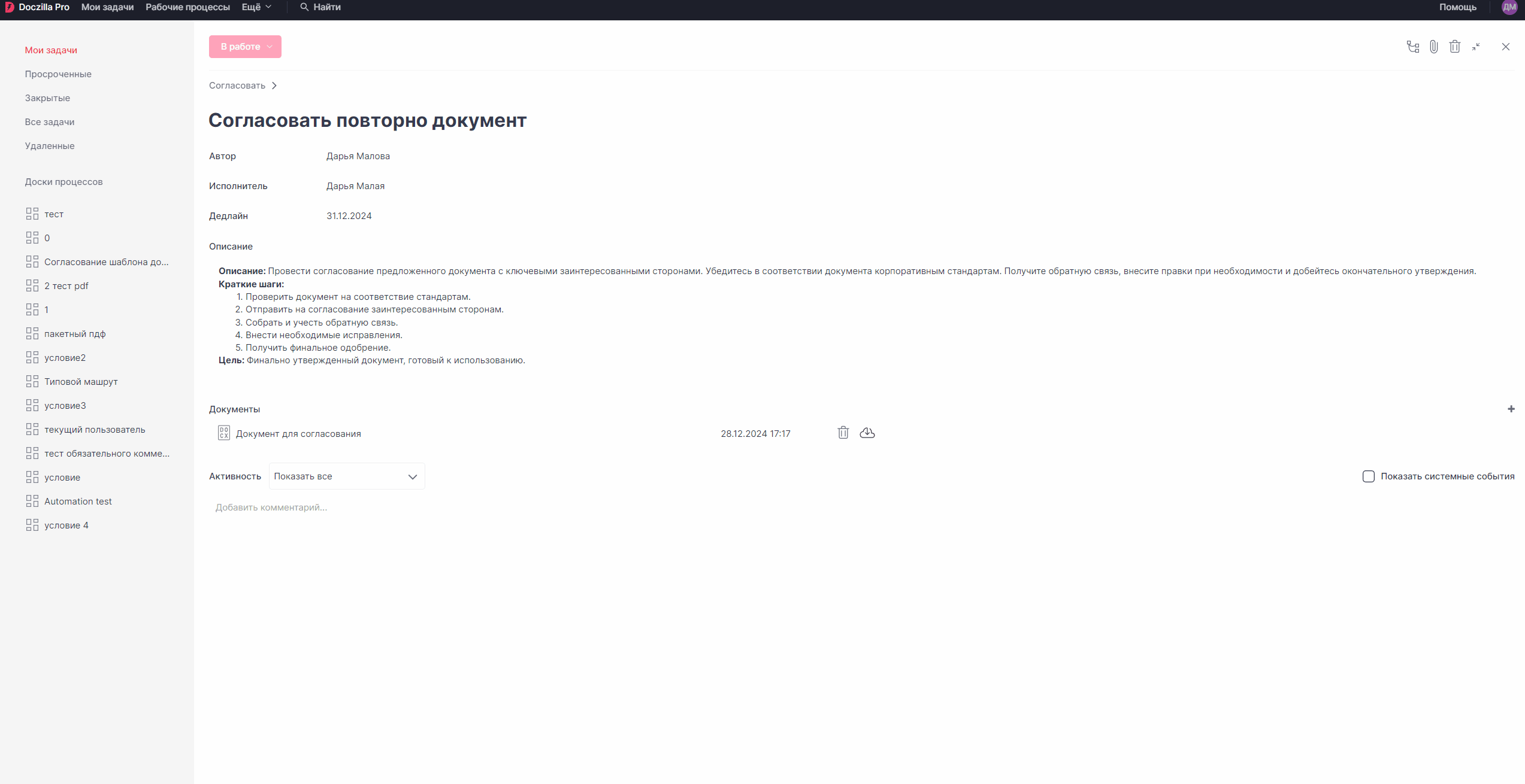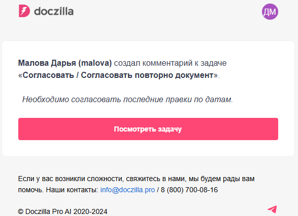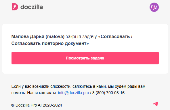 После выполнения/отклонения задачи исполнителем автор получают уведомление, содержащее информацию о закрытии задачи. В уведомлении есть ссылка Посмотреть задачу, которая позволяет ознакомиться с финальными комментариями и результатами проделанной работы.