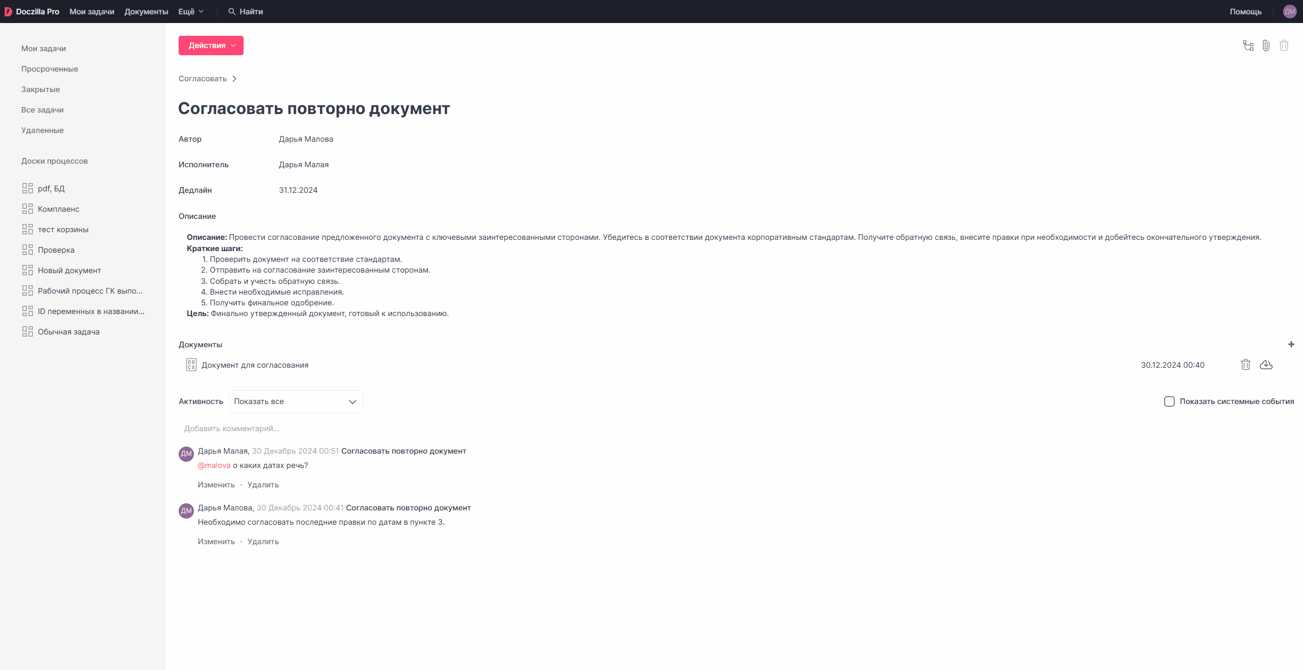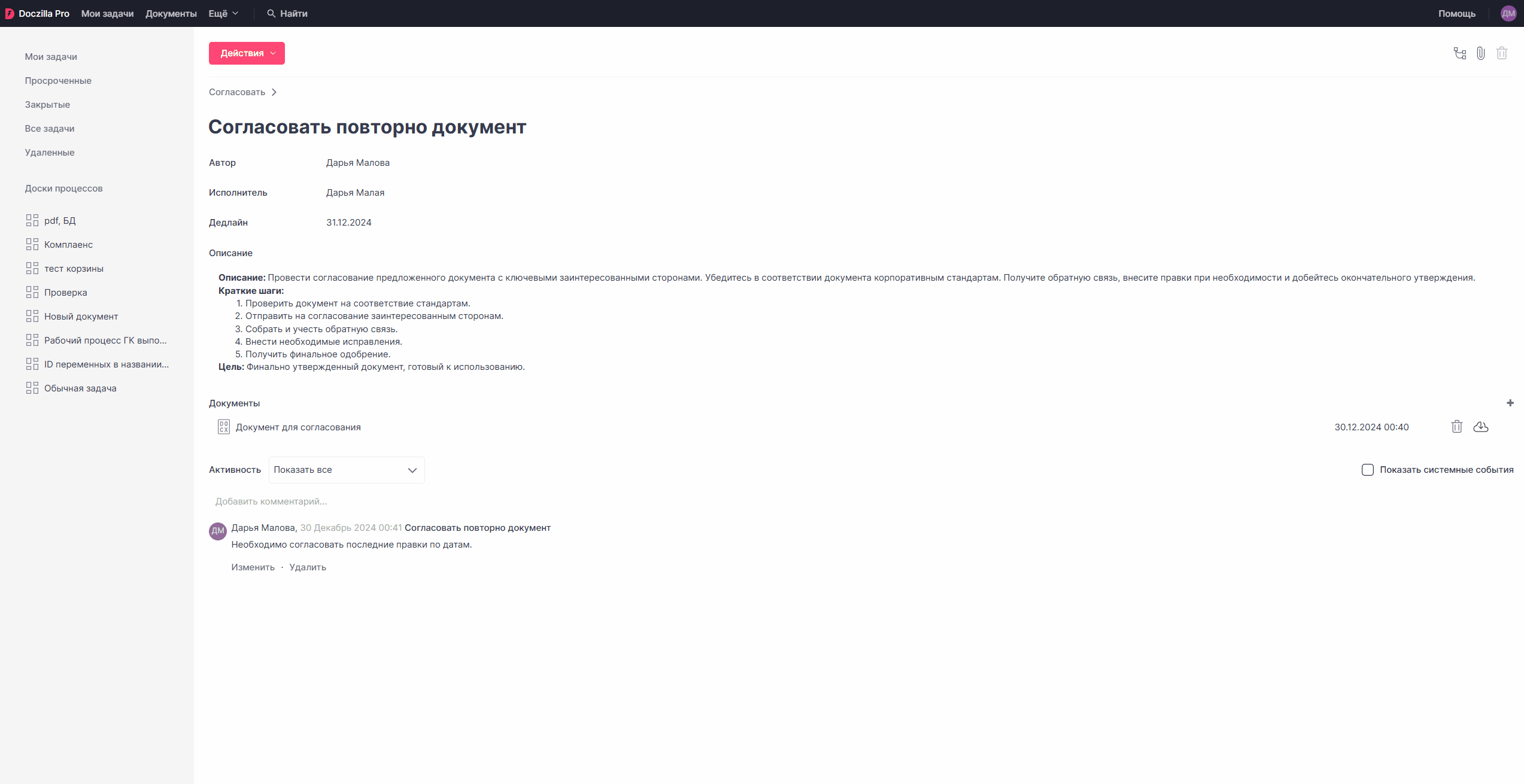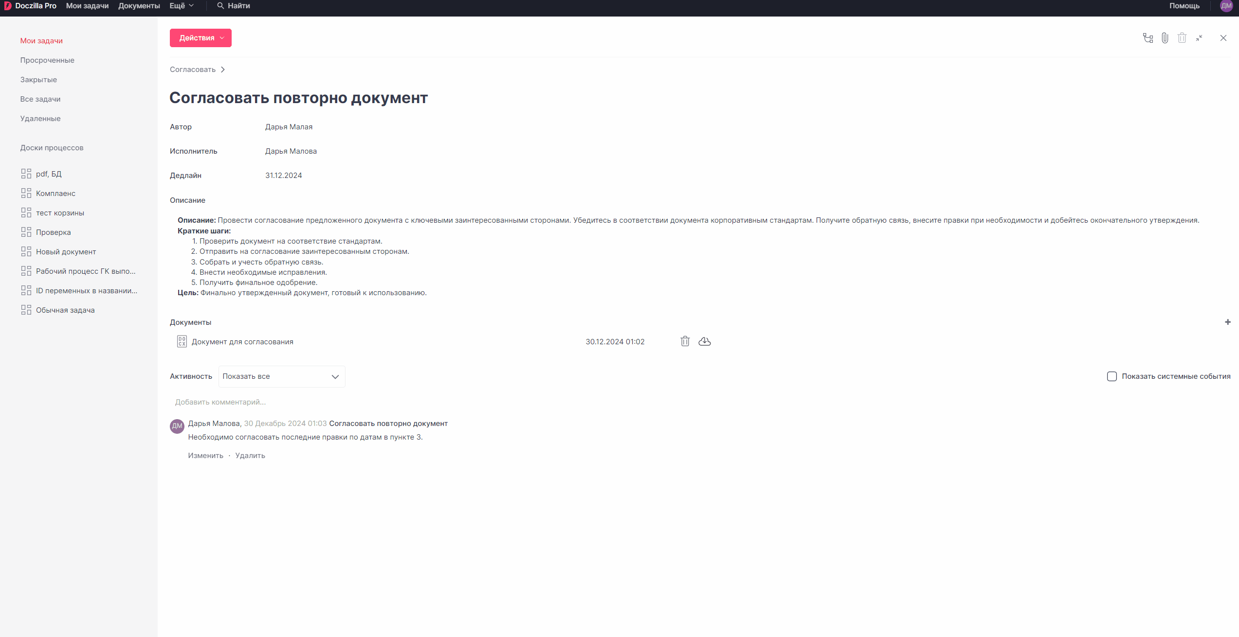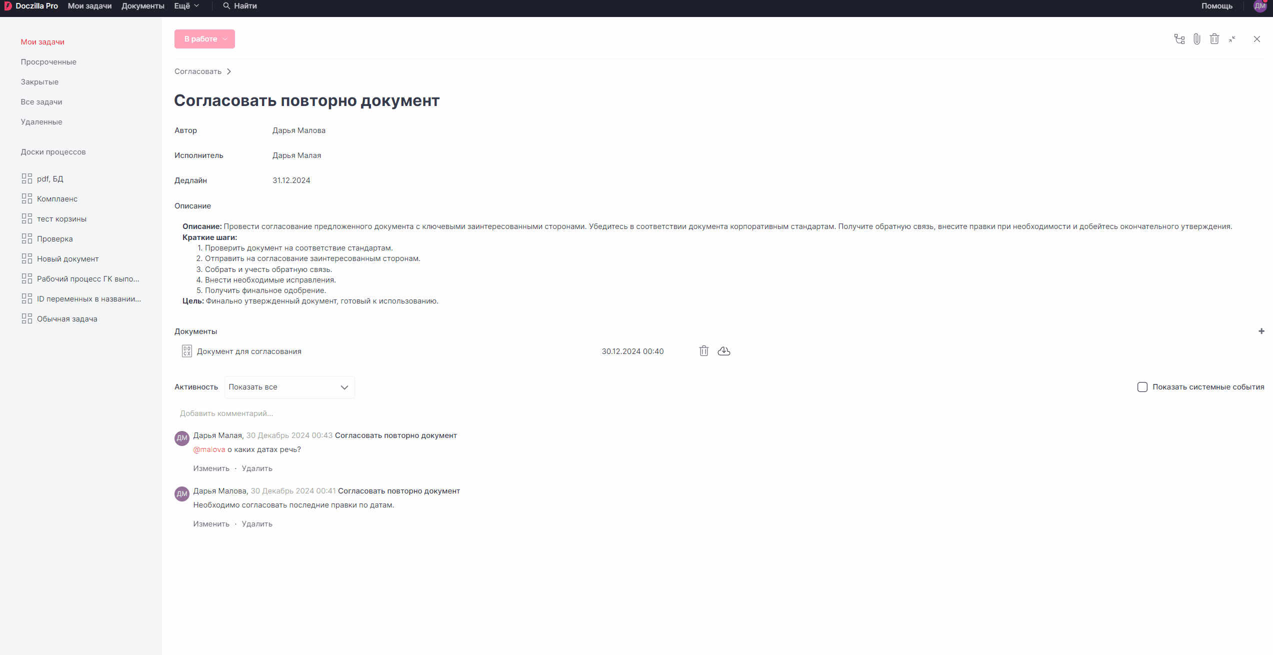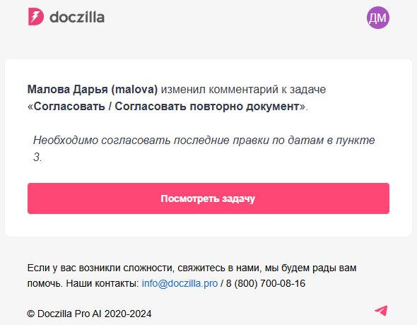 При изменении комментария к задаче другой участник согласования получает уведомление с обновленным текстом комментария и именем того, кто внёс изменения. Текст комментария доступен для чтения прямо в окне уведомления с возможностью перейти к задаче через ссылку Посмотреть задачу для продолжения обсуждения.