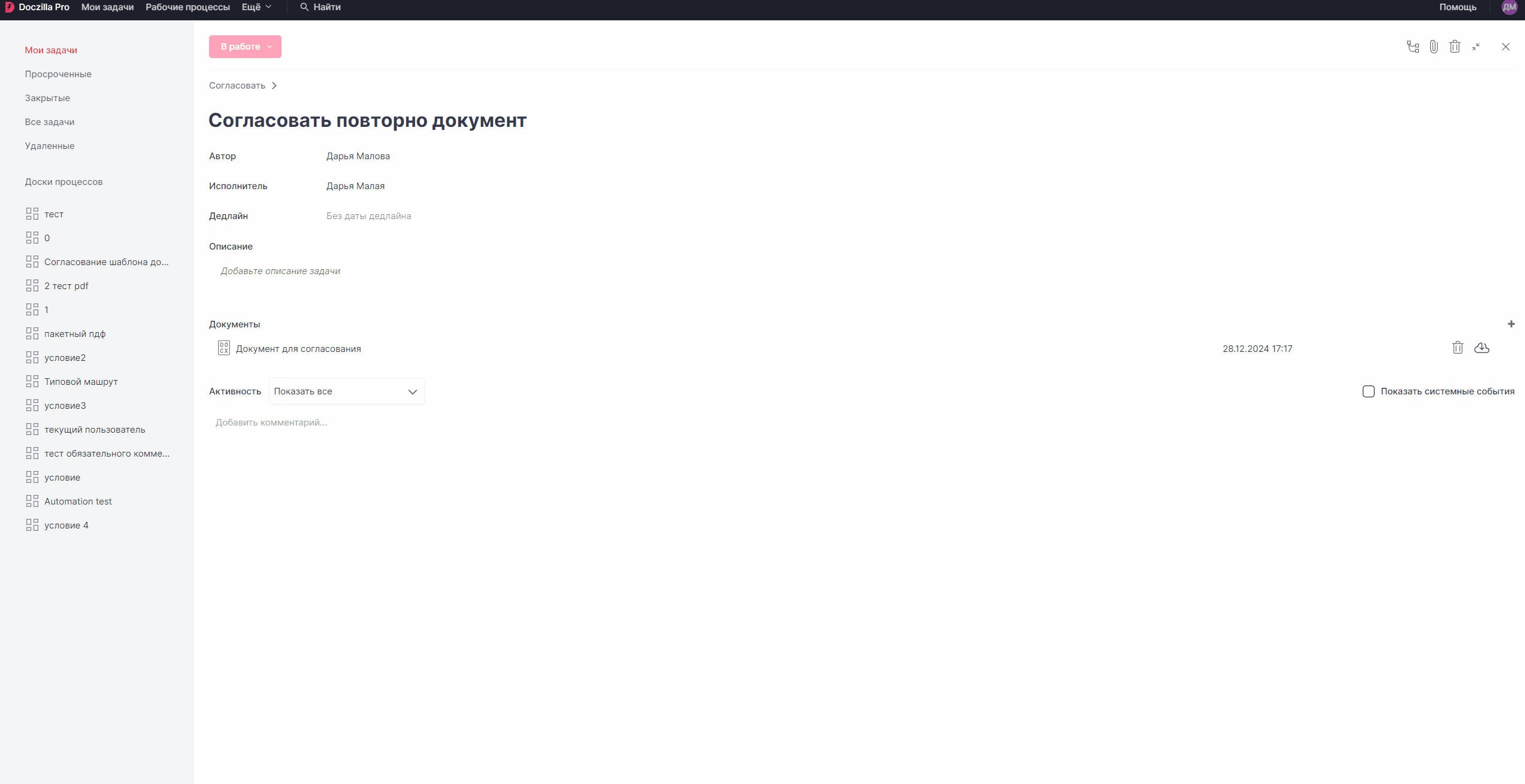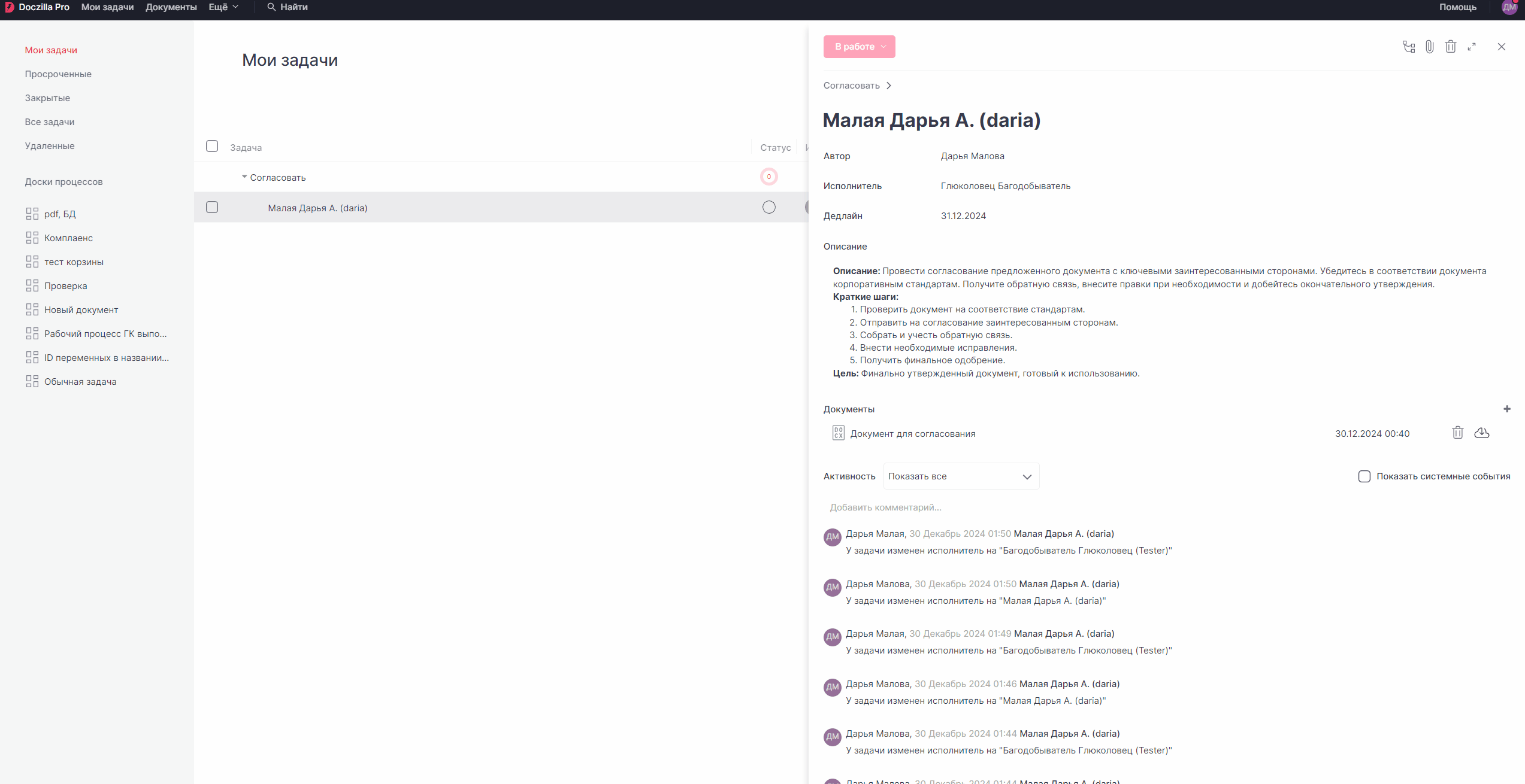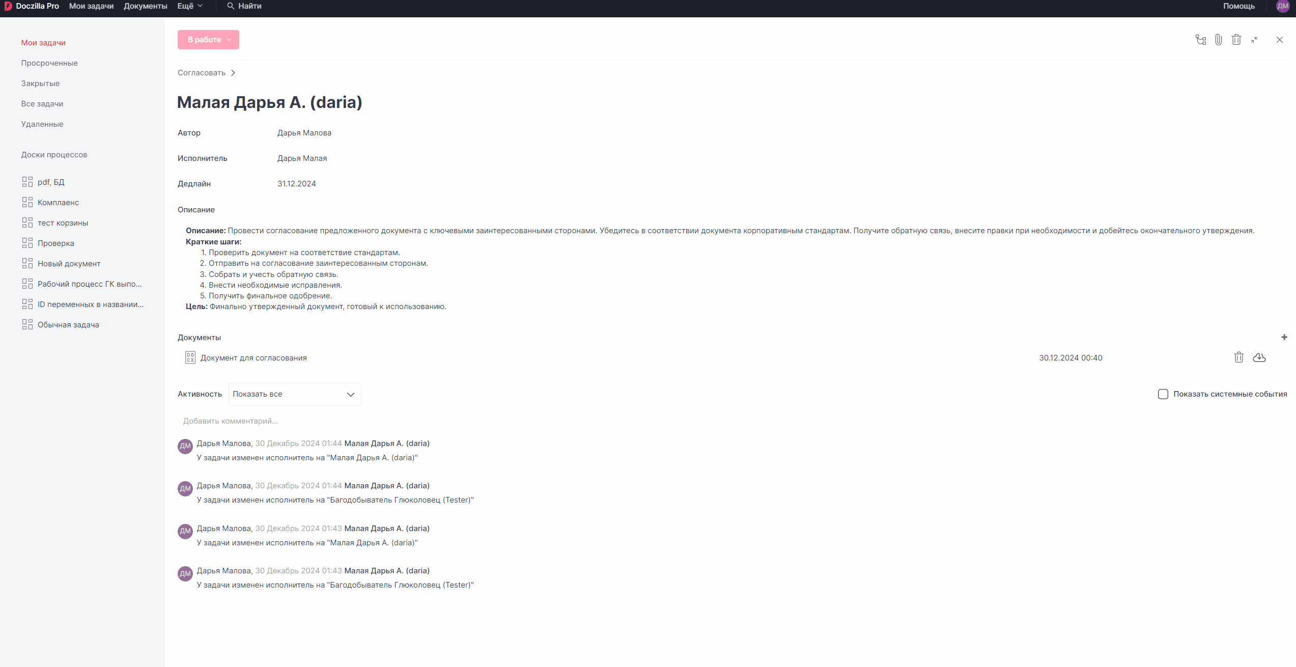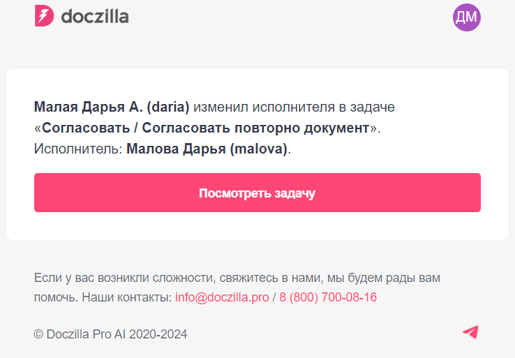Исполнитель может переназначить задачу на другого исполнителя. В этом случае уведомление о смене исполнителя придет автору процесса, где будет информация о новом исполнителе и ссылка Посмотреть задачу