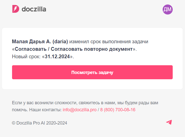 Когда автор/исполнитель изменяет сроки исполнения задачи, исполнитель/автор получает уведомление, содержащее обновлённые временные рамки и имя автора изменений. В уведомлении также есть ссылка Посмотреть задачу, чтобы легко просмотреть измененную информацию и спланировать дальнейшие действия.