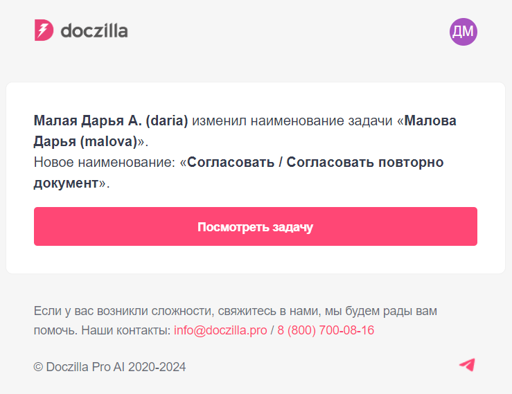 Если автор/исполнитель изменяет название задачи, исполнитель/автор получает уведомление с новым наименованием и именем автора изменений. Уведомление включает ссылку Посмотреть задачу, которая позволяет ознакомиться с текущими данными.