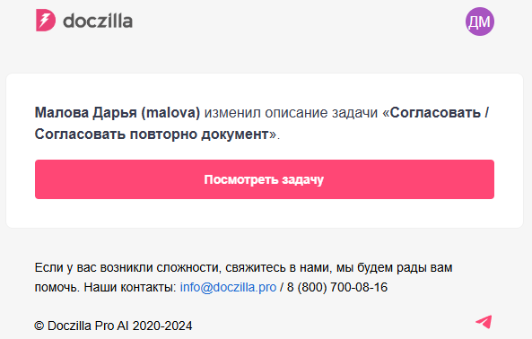 При обновлении описания задачи автором/исполнителем, исполнитель/автор получает уведомление, где указана новая информация и автор изменения. Ссылка Посмотреть задачу в уведомлении позволяет быстро перейти к просмотру обновленного описания.