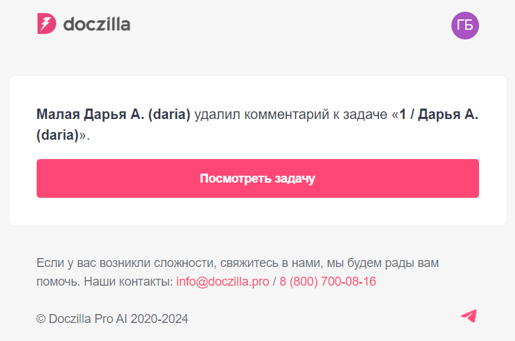 В случае удаления комментария другой участник получает уведомление с указанием автором удаления. В уведомлении также предоставляется ссылка Посмотреть задачу, позволяющая пользователям просмотреть текущий список комментариев.