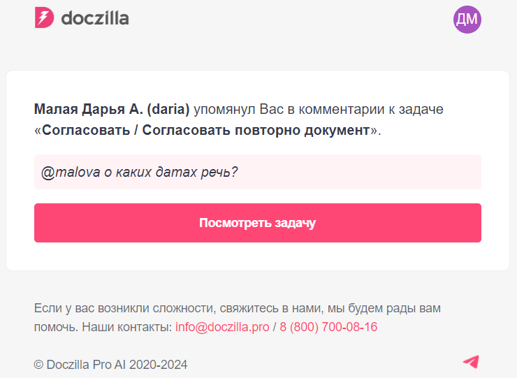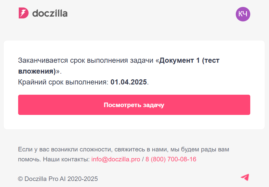 Уведомление приходит всем участникам процесса. В уведомлении также предоставляется ссылка Посмотреть задачу, позволяющая пользователям перейти к карточке задачи.