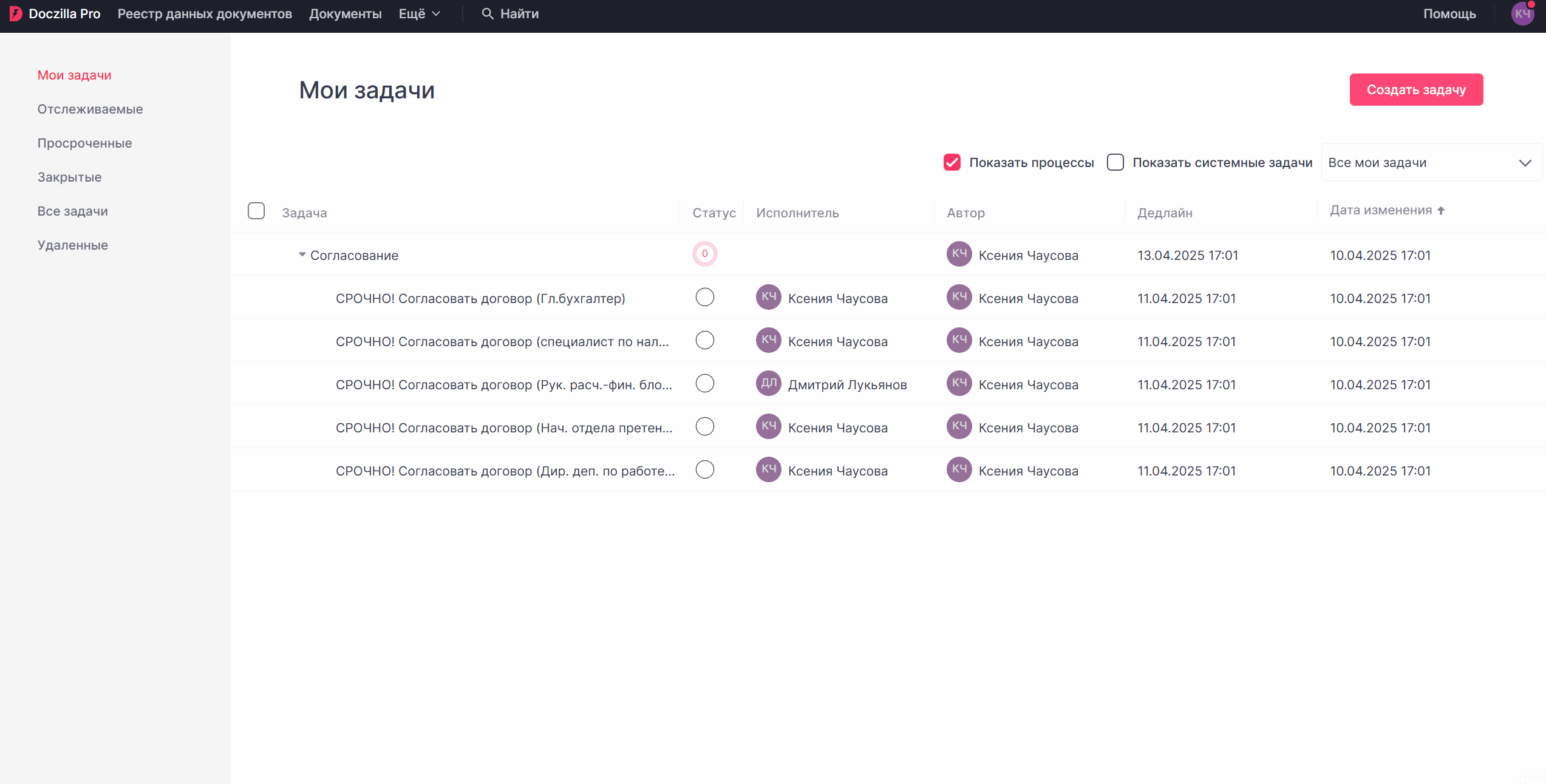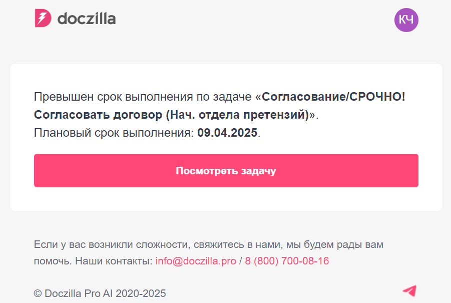 В случае превышения срока и автор процесса, и исполнитель получают уведомление с указанием планового срока выполнения задачи. В уведомлении также предоставляется ссылка Посмотреть задачу, позволяющая пользователям перейти к карточке просроченной задачи.